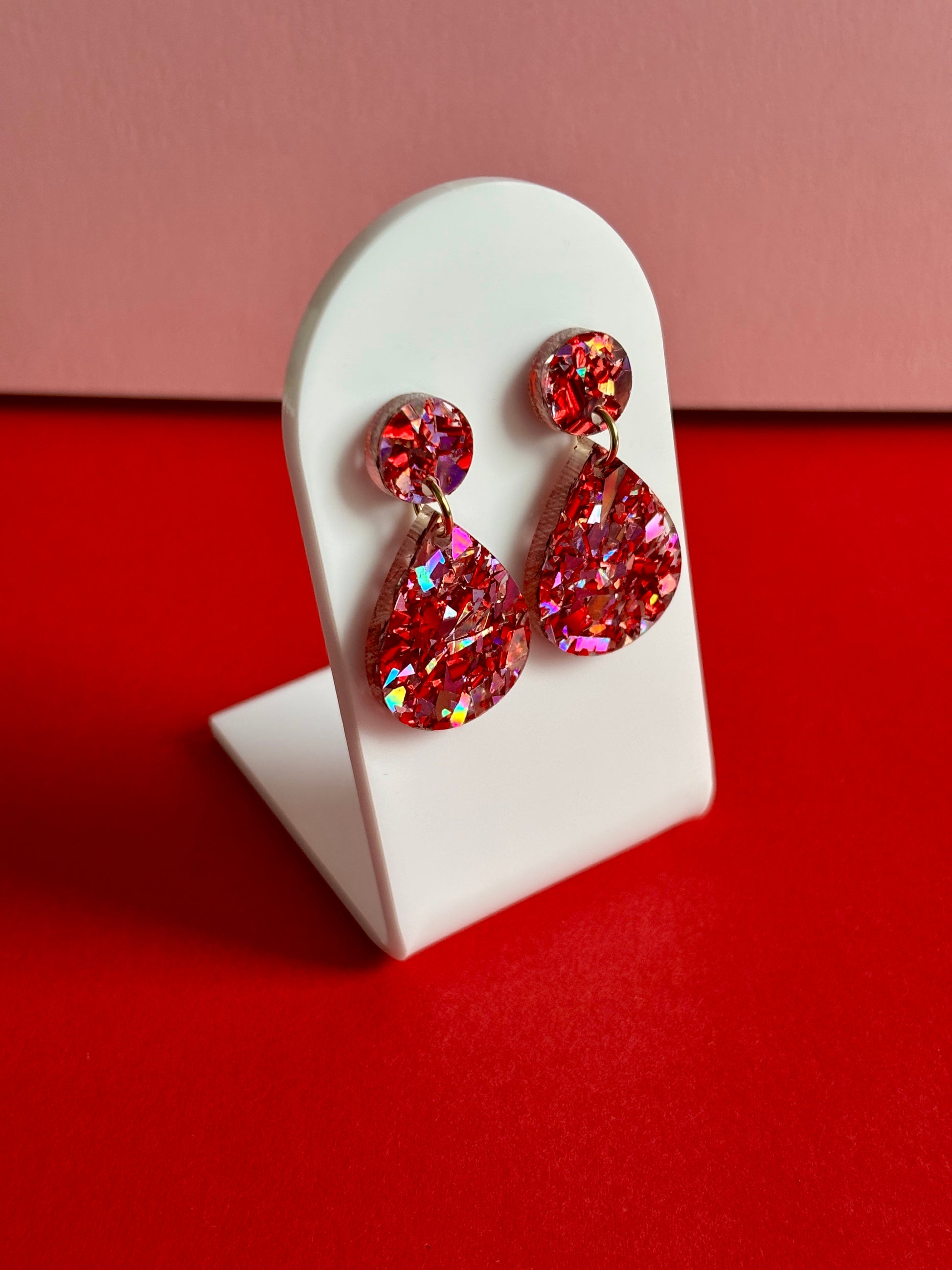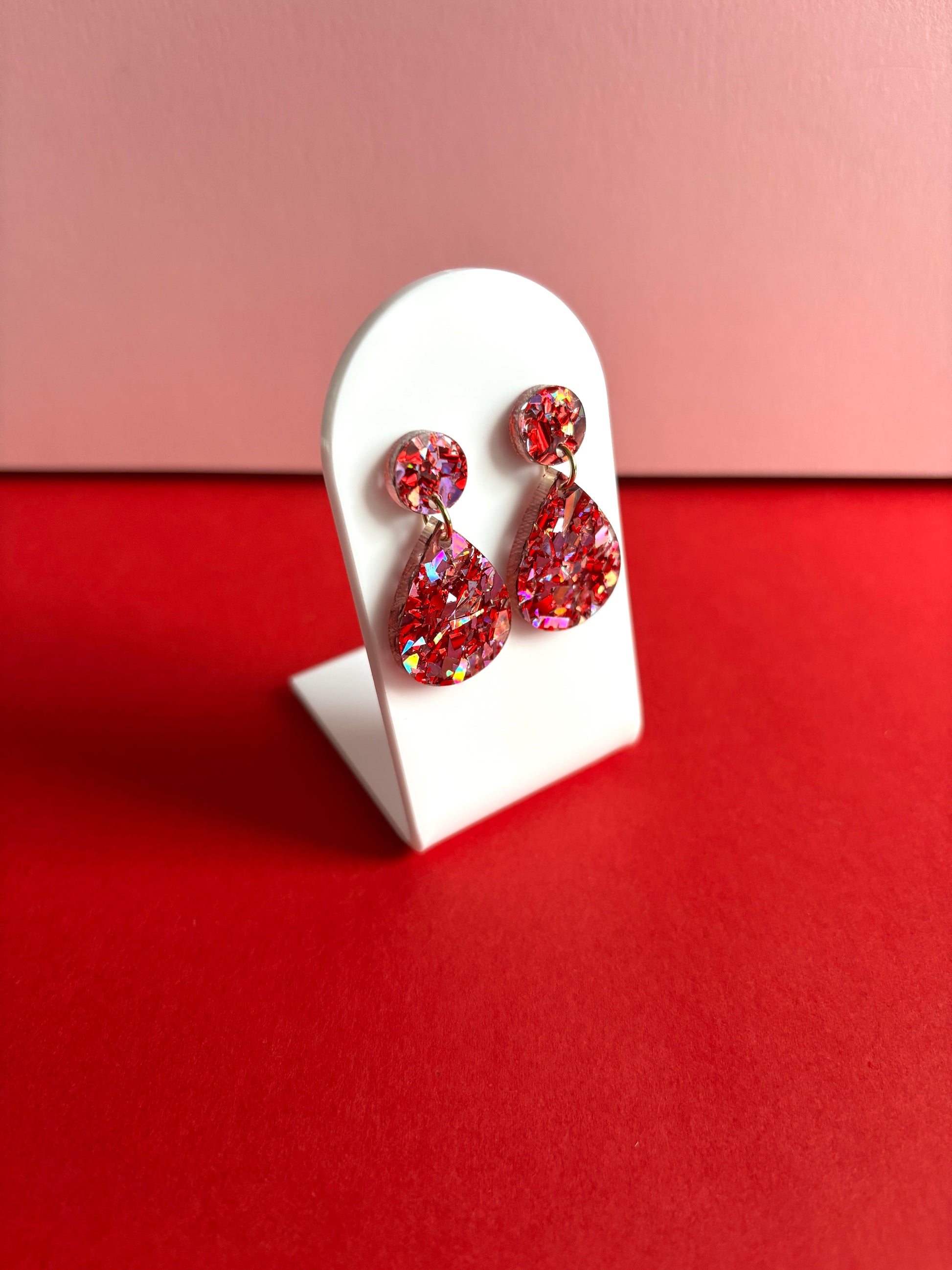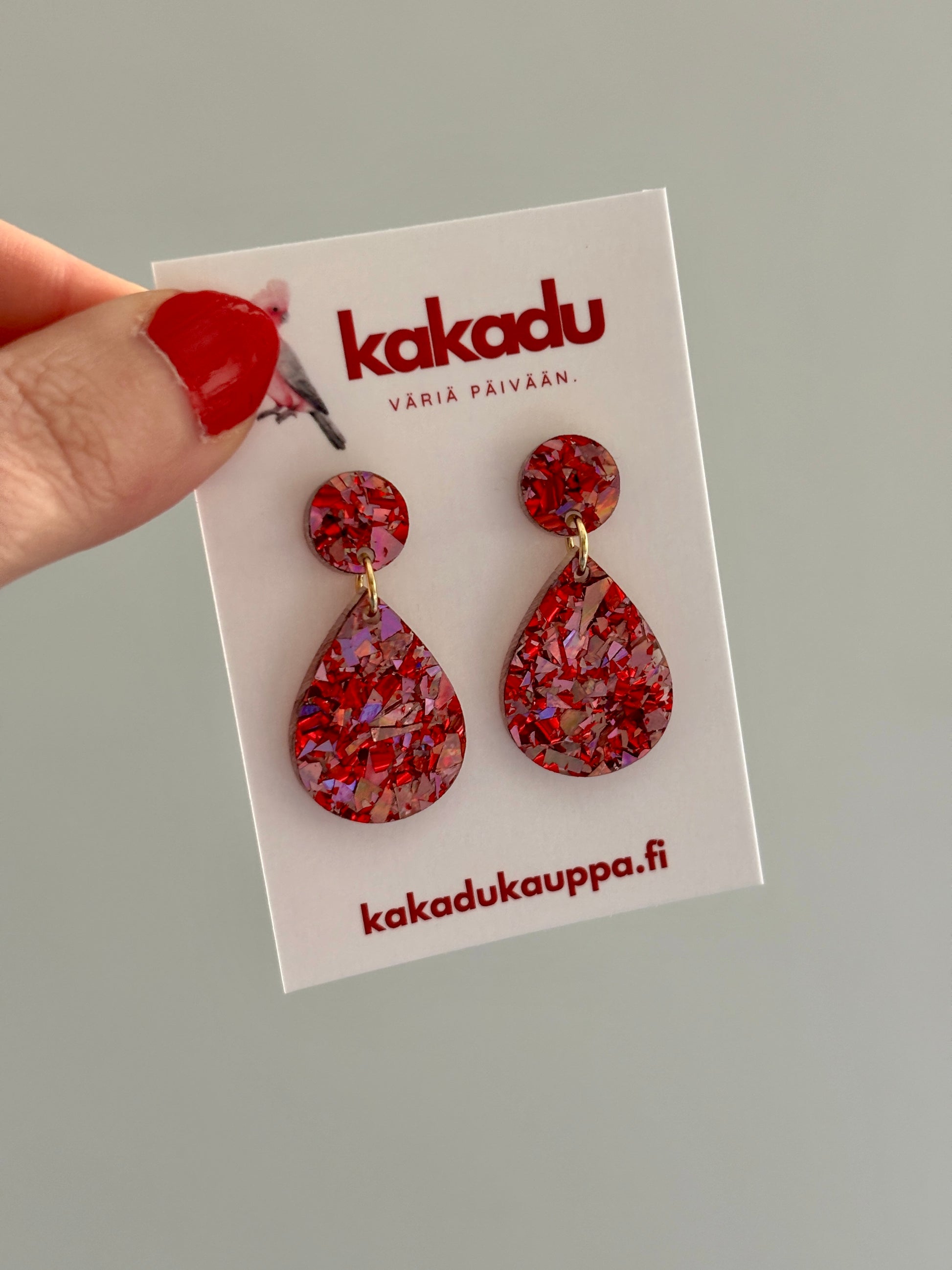 Juhlapisarat ovat ihana malli ja tässä se vähän isommassa koossa juhlavampaan tunnelmaan. Isompi siis kuin nämä, mutta silti kooltaan hyvin hillitty ja kevyt. Klassinen muoto on helppo yhdistää moneen. Väri on upea sekoitus punaisen sävyjä, jotka välkehtivät kauniisti valossa. Nappikiinnityksen ansiosta tukeva korvassa ja materiaalin ansiosta ei muuten korvalehdessä paina pidempikään juhlapäivä.
