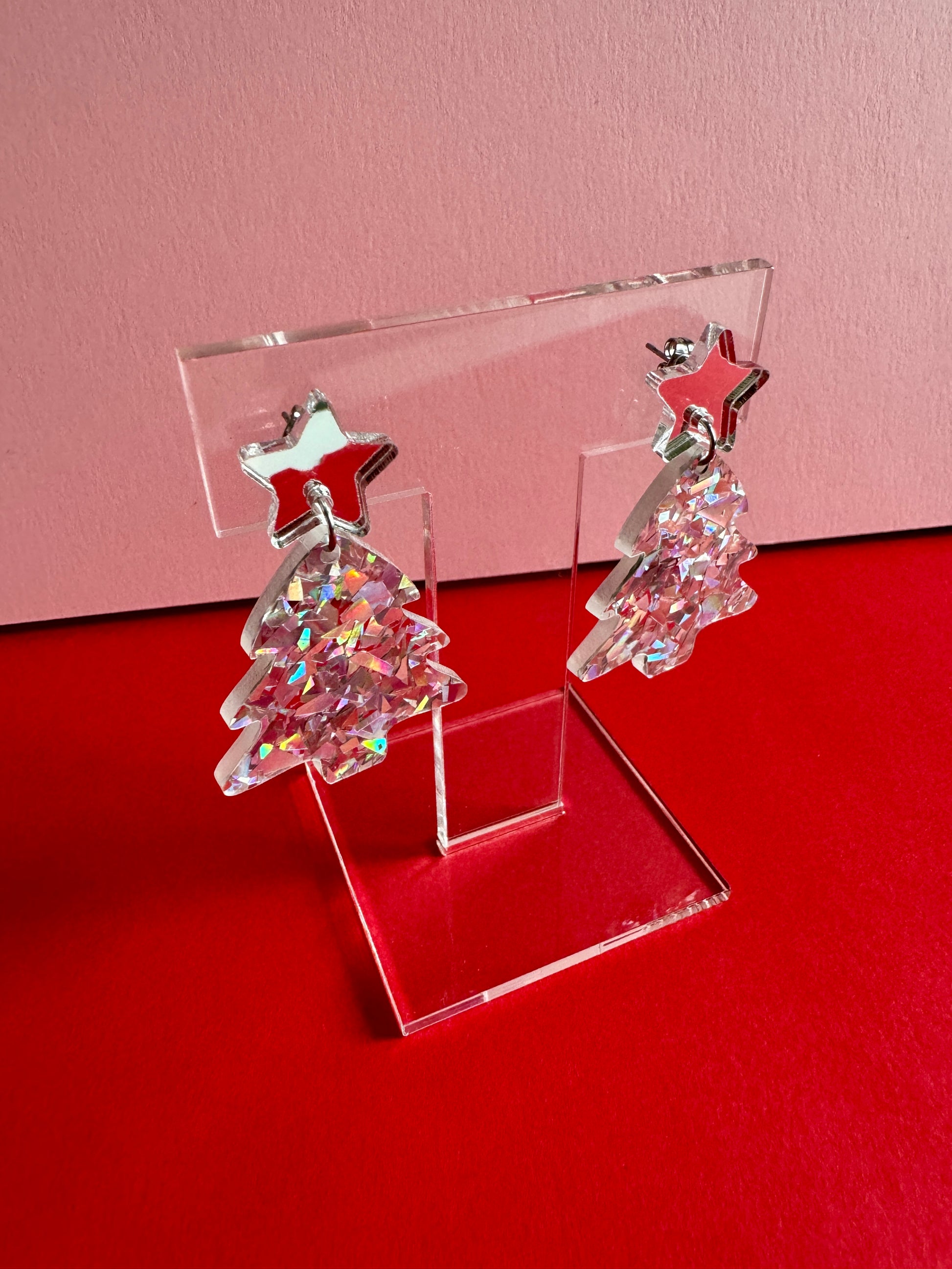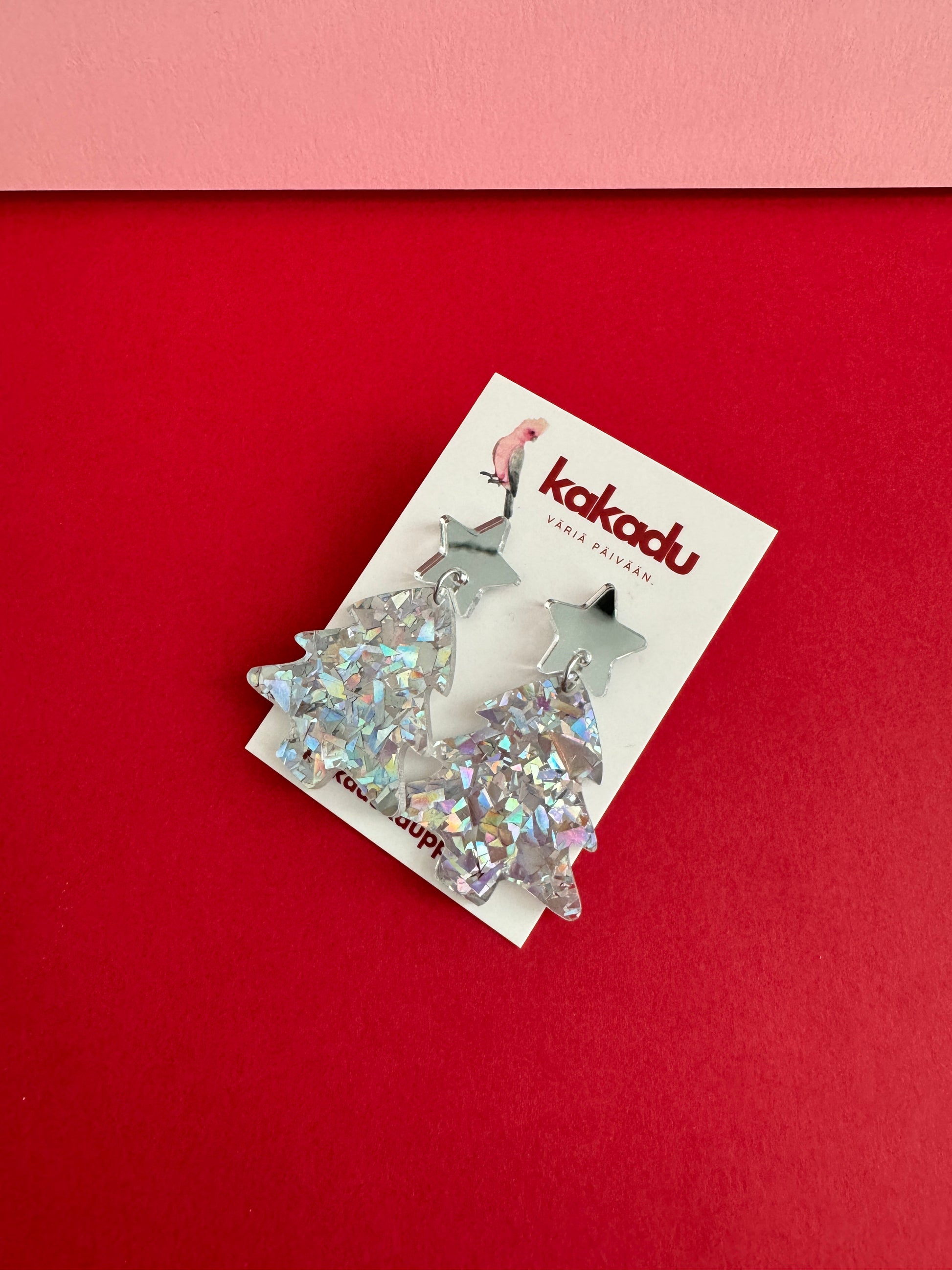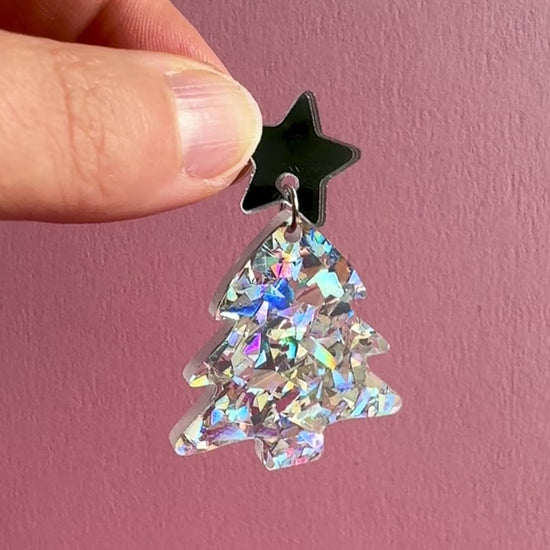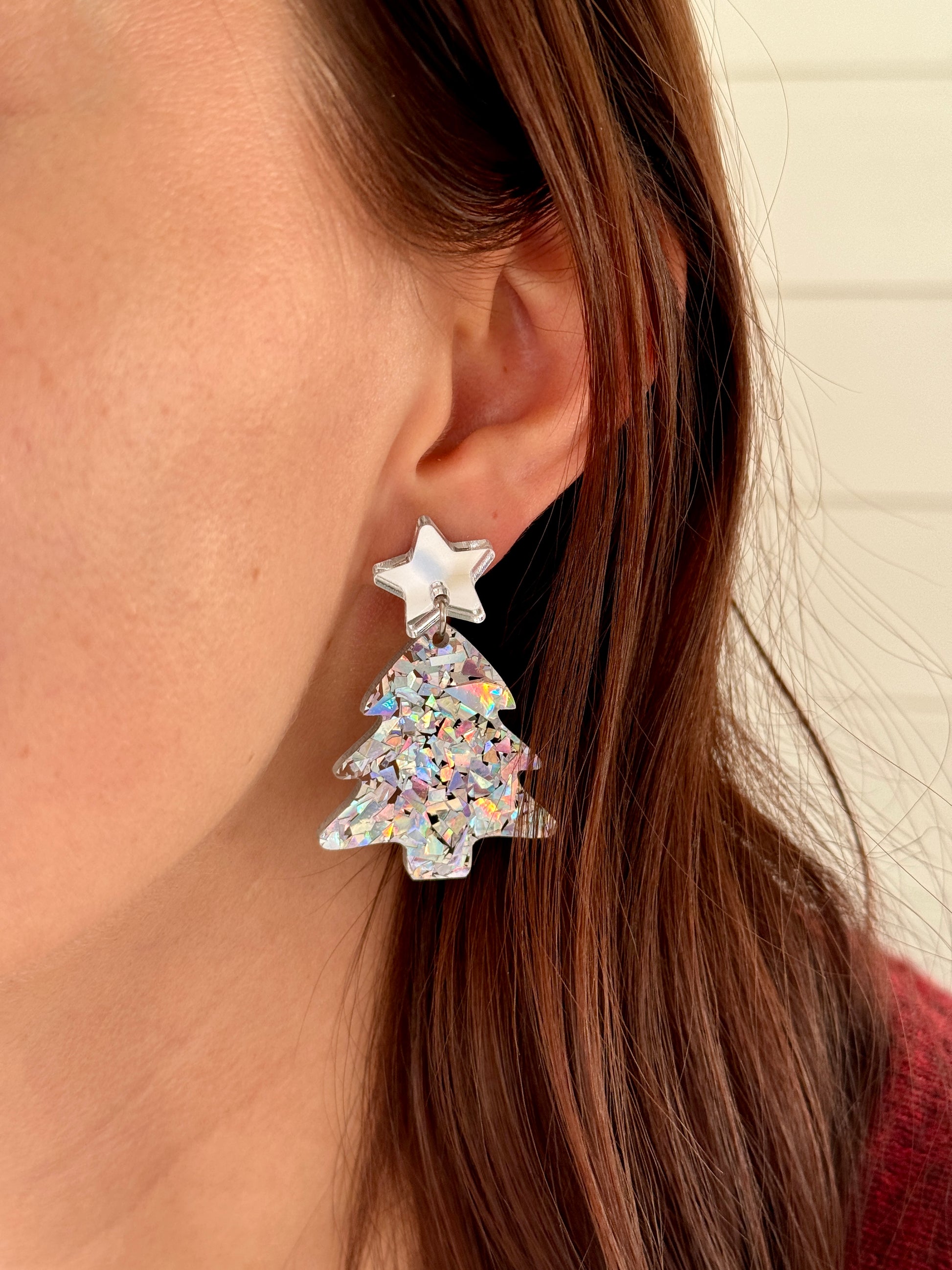 Roikkuvat joulukuusen muotoiset korvakorut. Nappina on hopeinen peiliakryylitähti. Joulukuusi on upeaa rouheaa hopeista glitteriä, joka kimaltelee valossa monivärisen kauniisti. Kooltaan näyttävät, mutta silti sopusuhtaiset korvissa ja kevyet korvakorut käyttää. Yksivärisyytensä puolesta helppo yhdistää moneen. Ihanaa kimallusta jouluun!