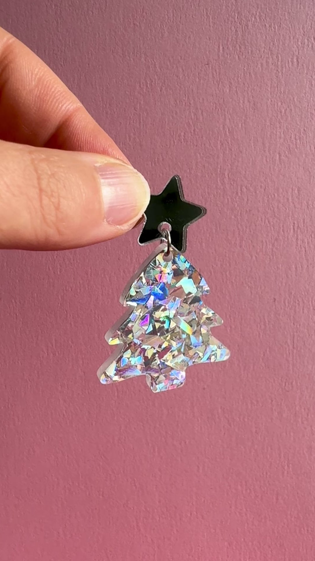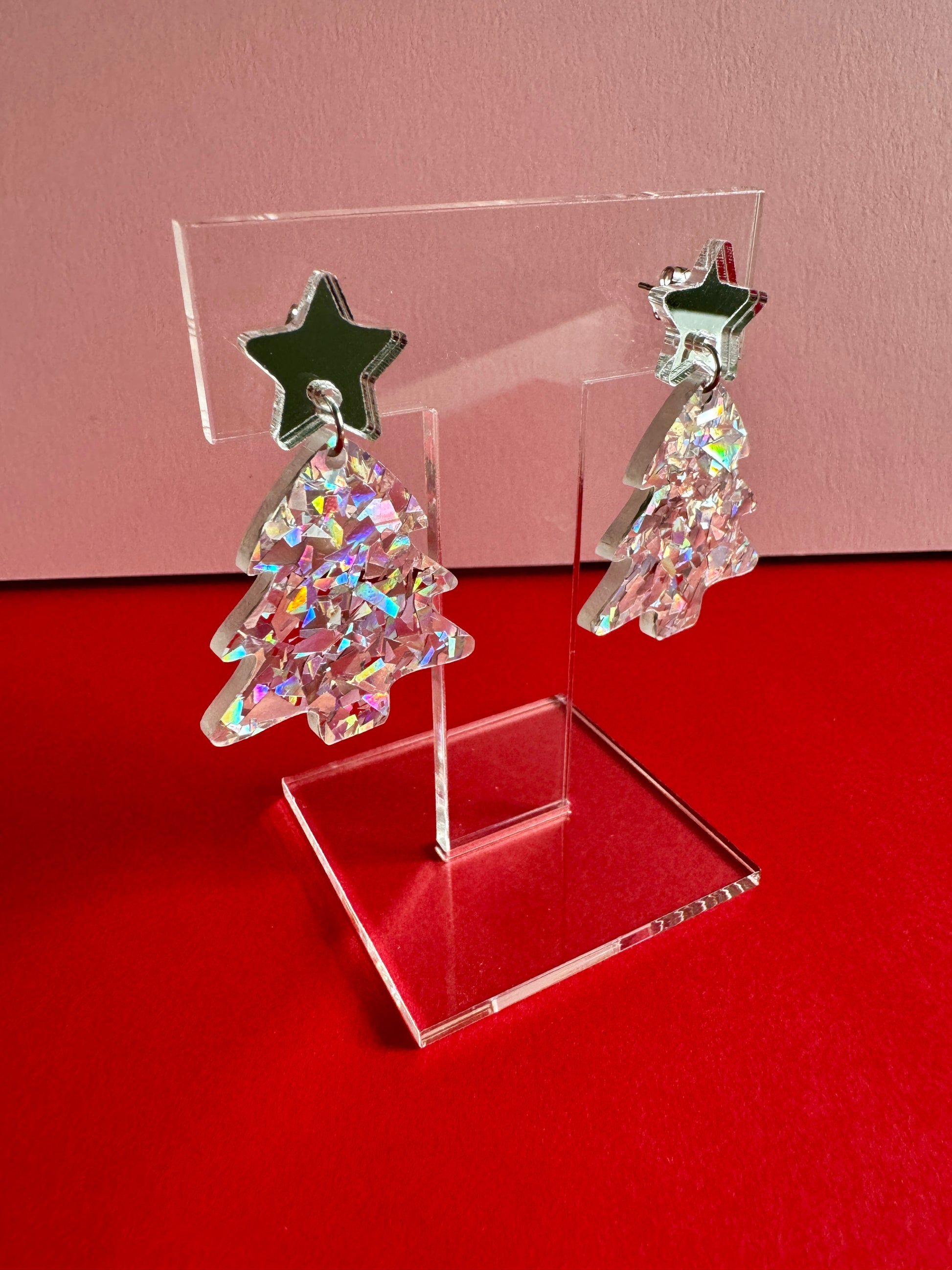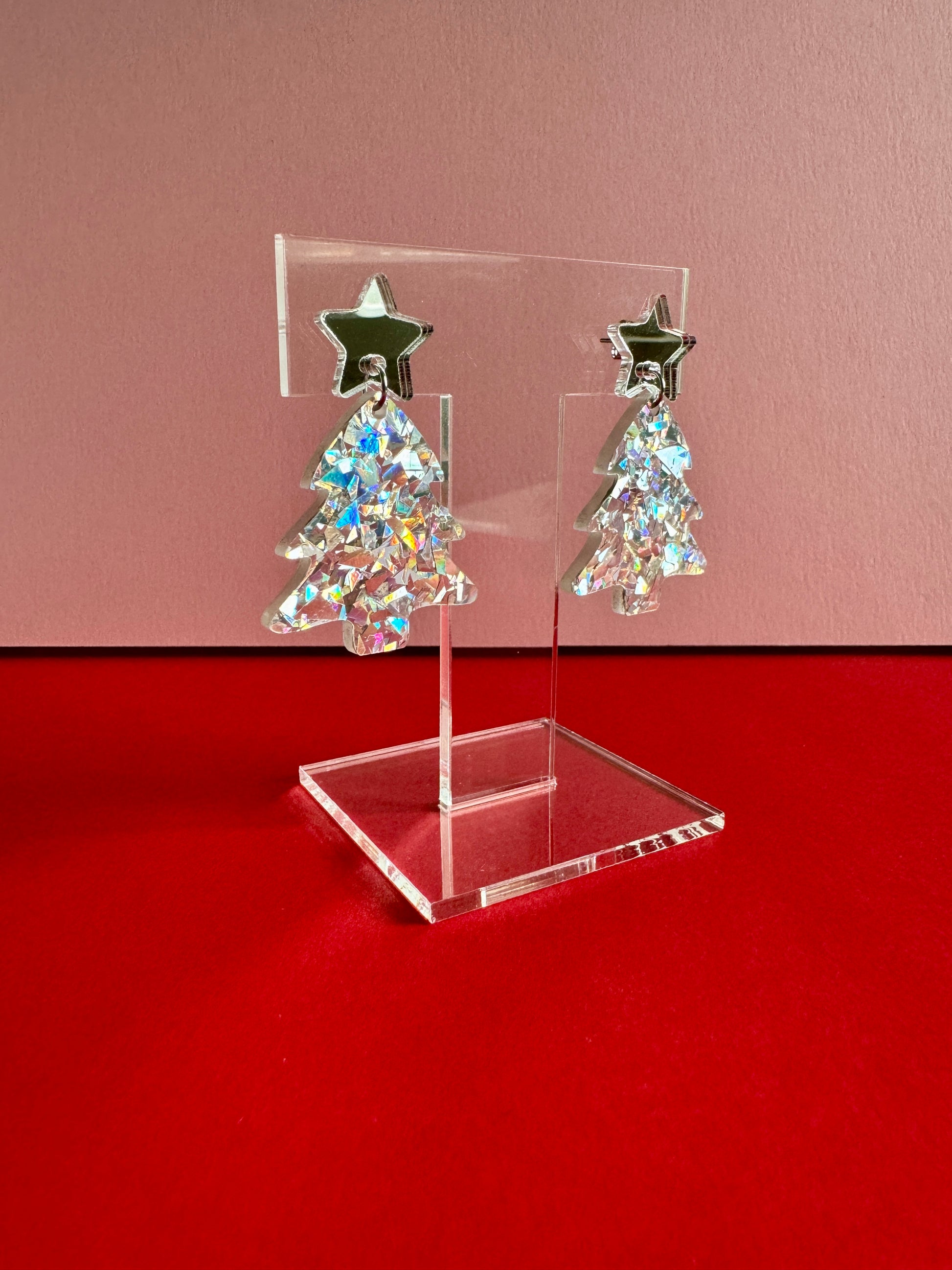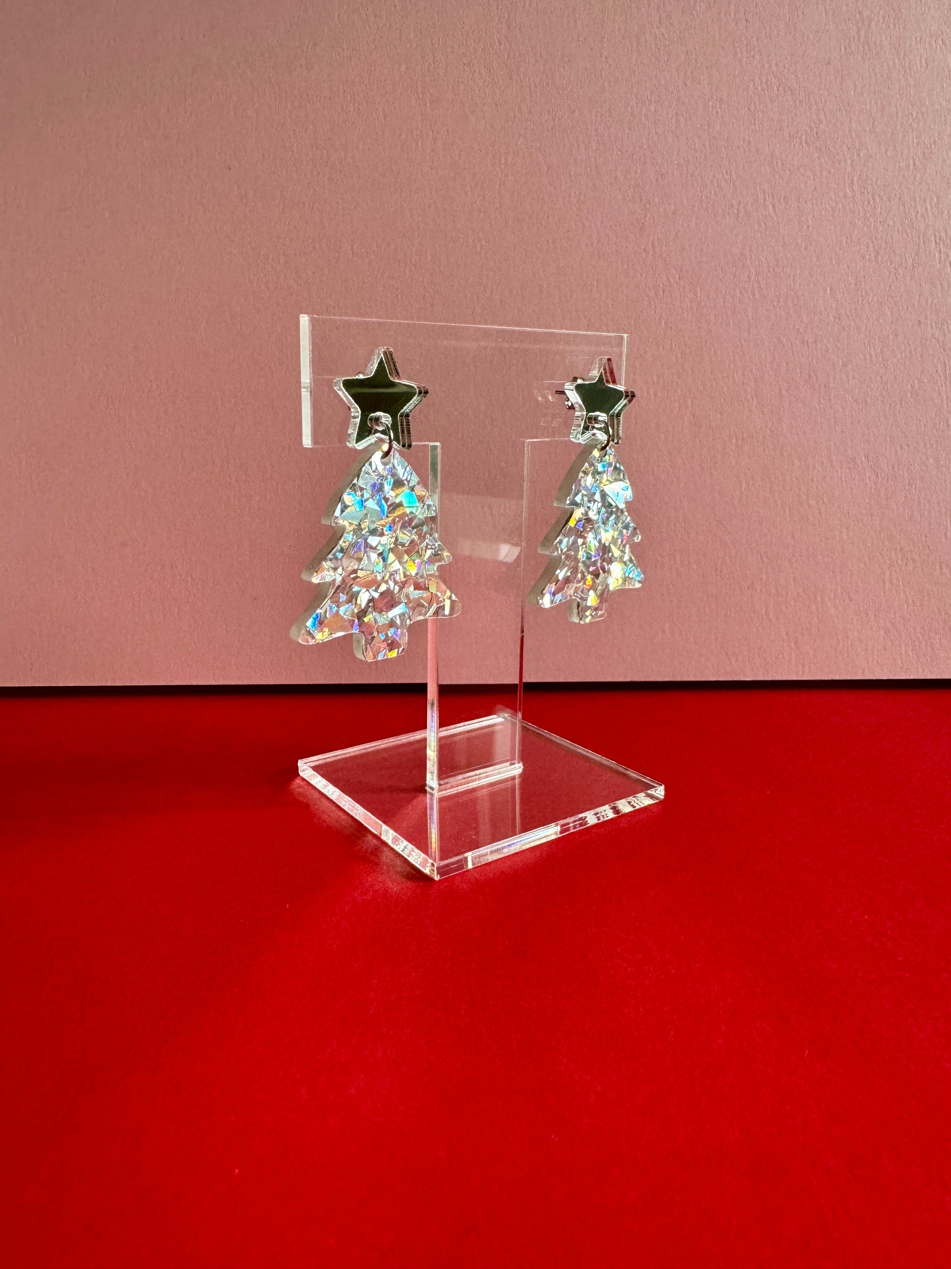 Roikkuvat joulukuusen muotoiset korvakorut. Nappina on hopeinen peiliakryylitähti. Joulukuusi on upeaa rouheaa hopeista glitteriä, joka kimaltelee valossa monivärisen kauniisti. Kooltaan näyttävät, mutta silti sopusuhtaiset korvissa ja kevyet korvakorut käyttää. Yksivärisyytensä puolesta helppo yhdistää moneen. Ihanaa kimallusta jouluun!