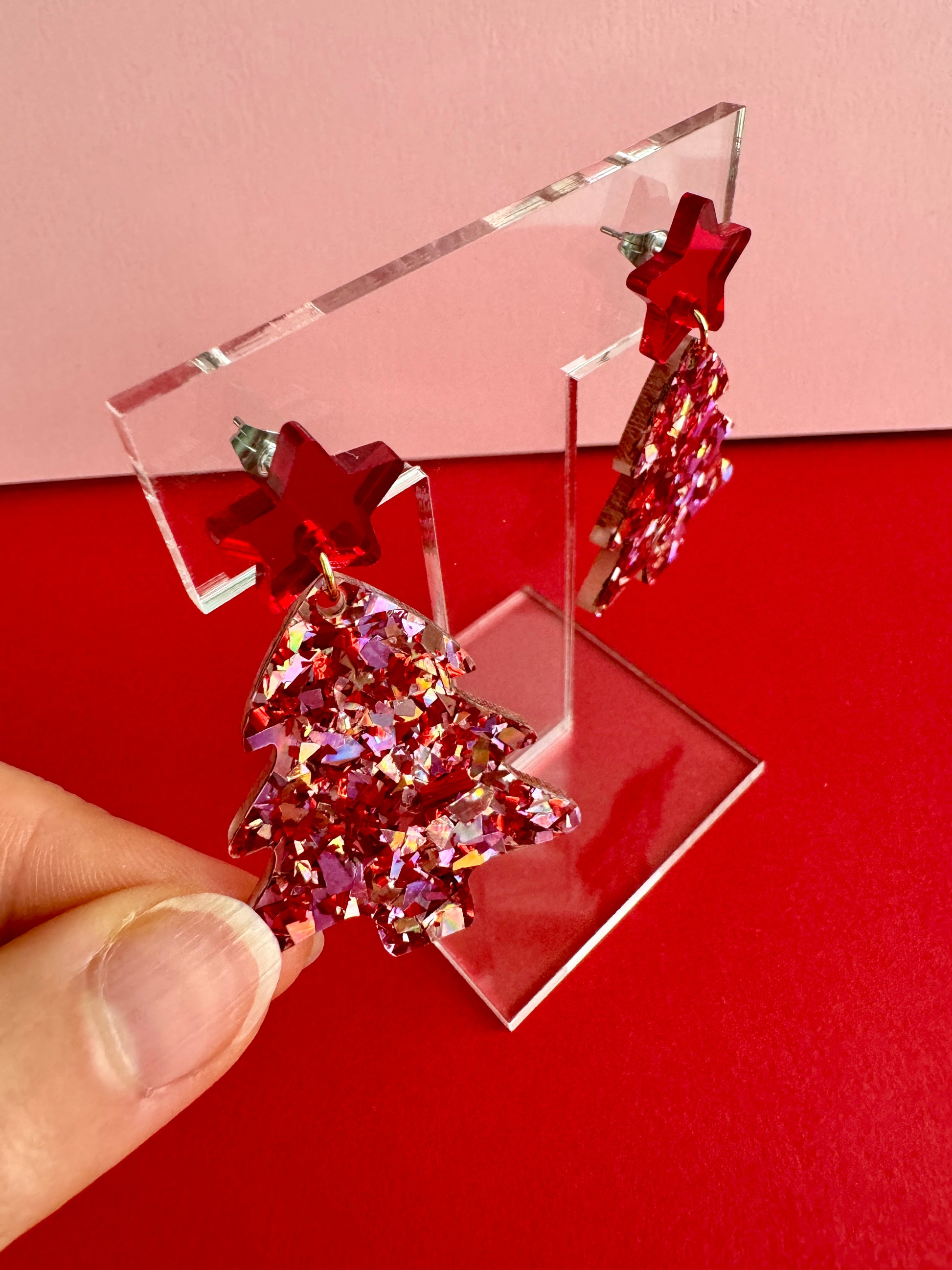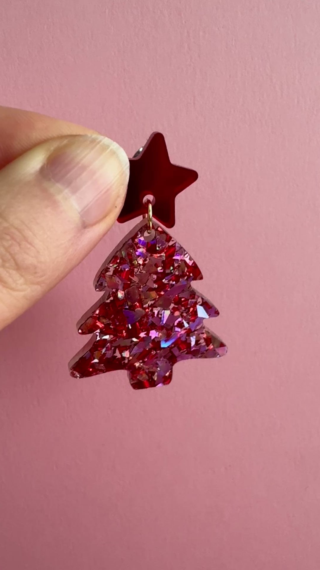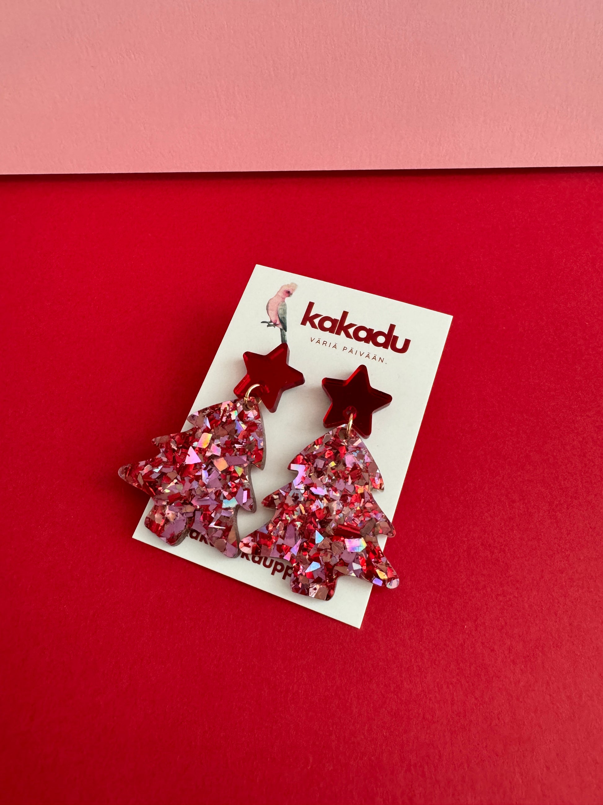 Roikkuvat joulukuusen muotoiset korvakorut. Nappina on punainen peiliakryylitähti. Joulukuusi on upea glittersekoitus punaisen eri sävyjä. Osat on kiinnitetty toisiinsa 18k kullalla pinnoitetulla renkaalla. Kooltaan näyttävät, mutta silti sopusuhtaiset korvissa ja kevyet korvakorut käyttää. Punainen ja kimallus sopivat kauniisti jouluun.