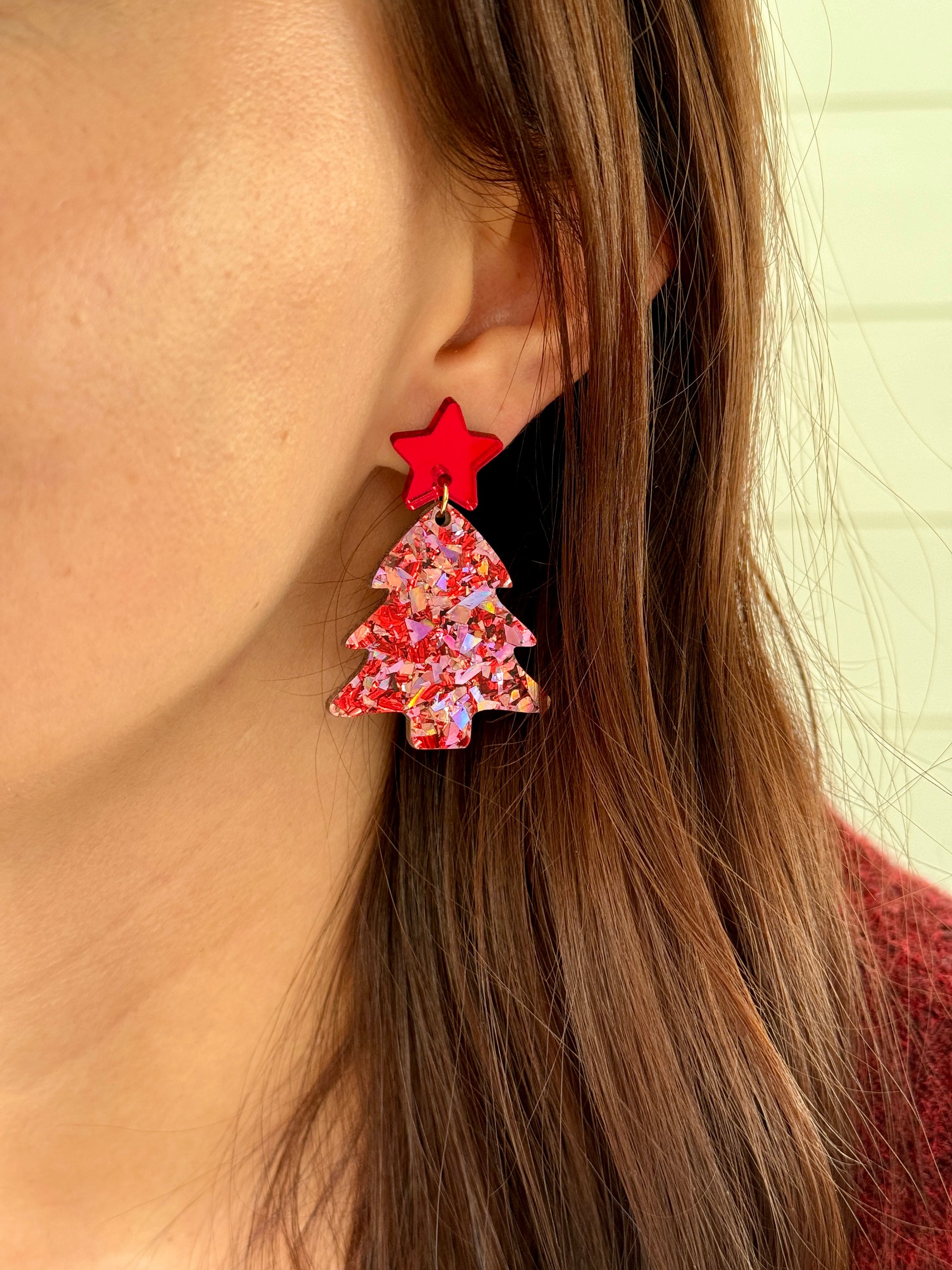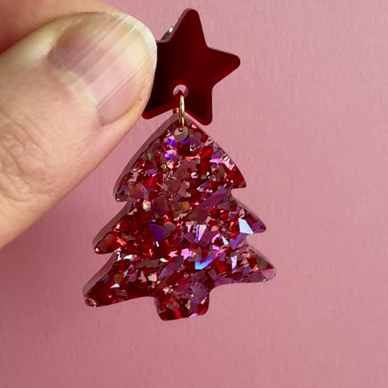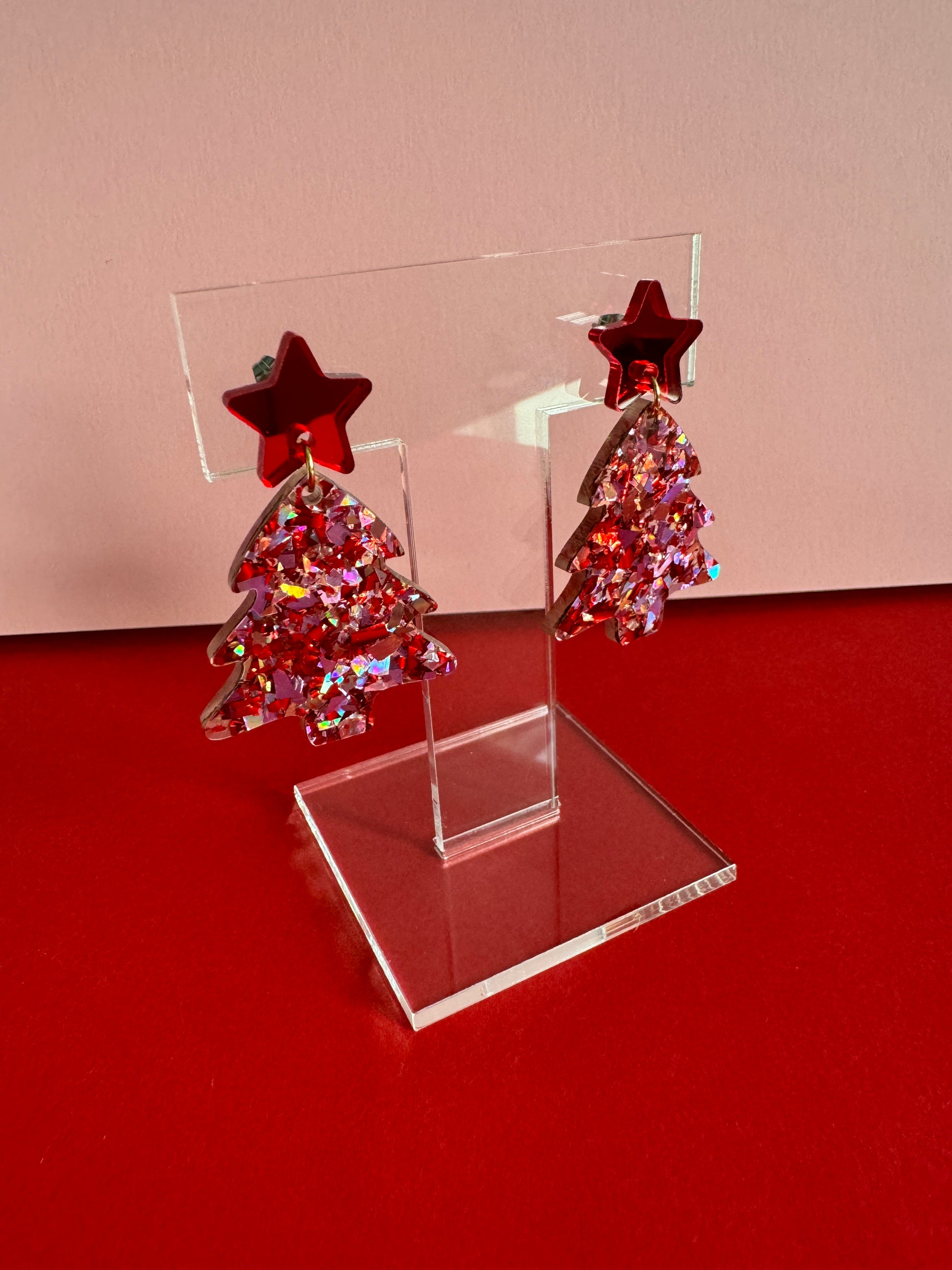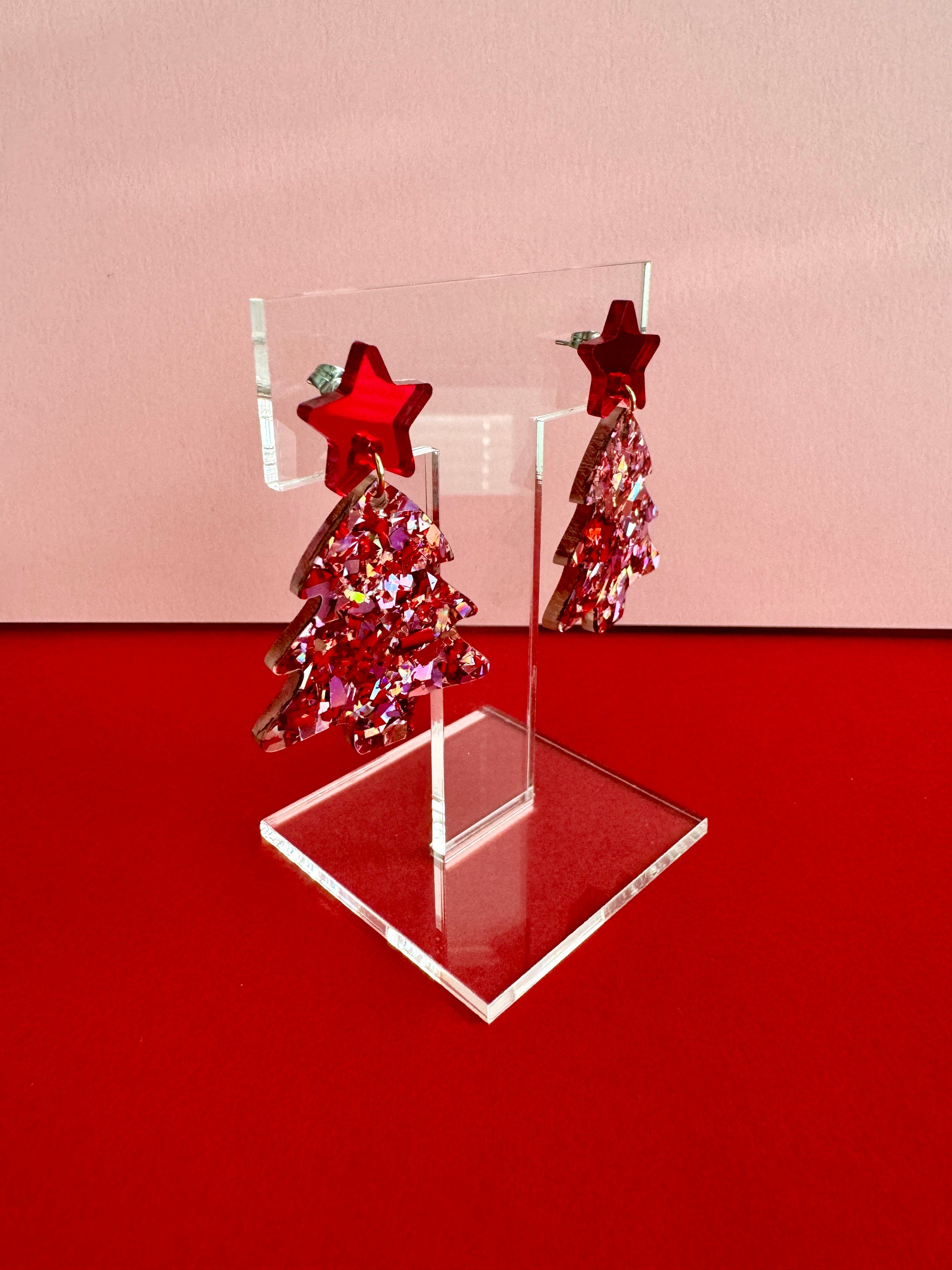 Roikkuvat joulukuusen muotoiset korvakorut. Nappina on punainen peiliakryylitähti. Joulukuusi on upea glittersekoitus punaisen eri sävyjä. Osat on kiinnitetty toisiinsa 18k kullalla pinnoitetulla renkaalla. Kooltaan näyttävät, mutta silti sopusuhtaiset korvissa ja kevyet korvakorut käyttää. Punainen ja kimallus sopivat kauniisti jouluun.