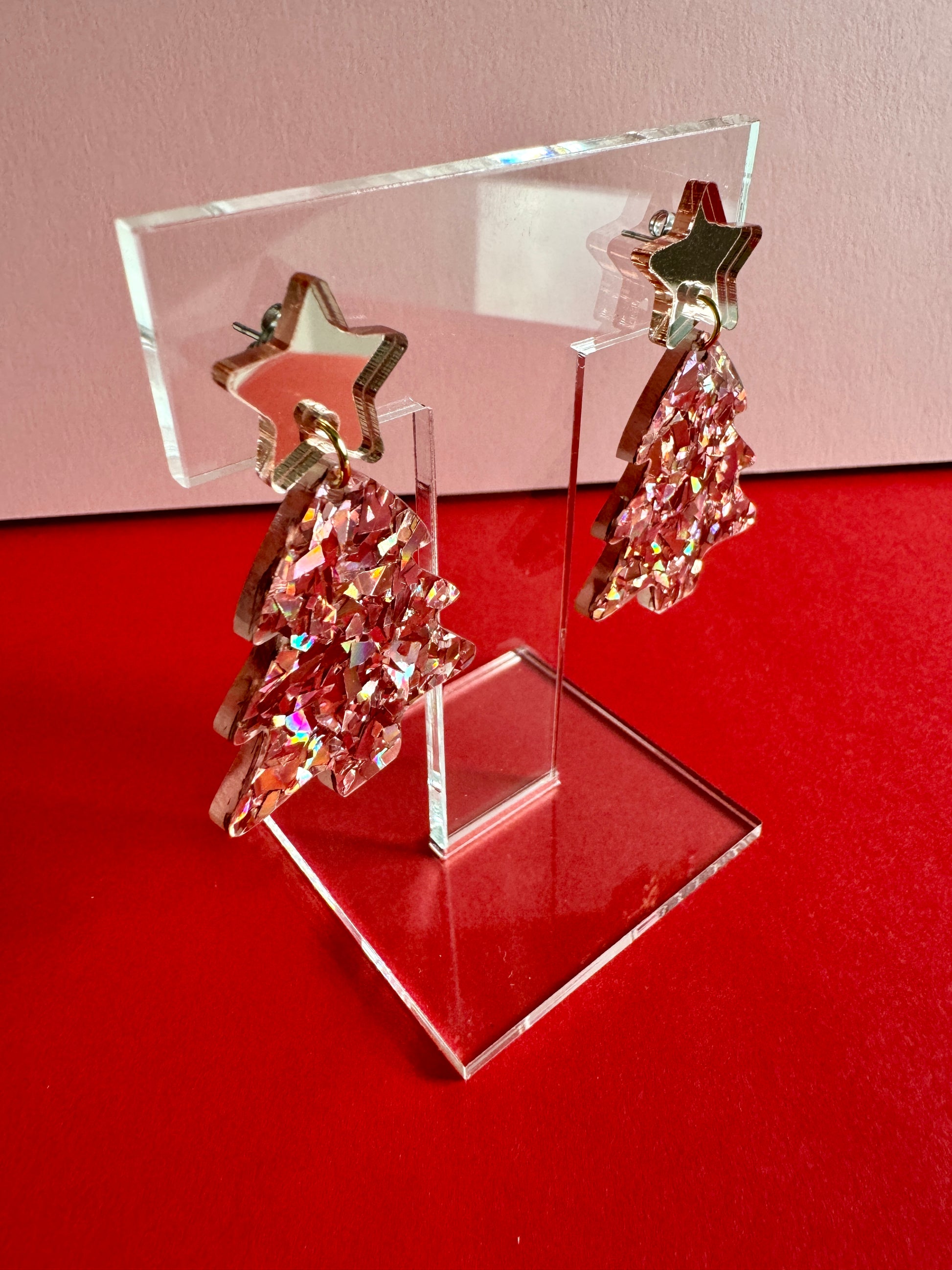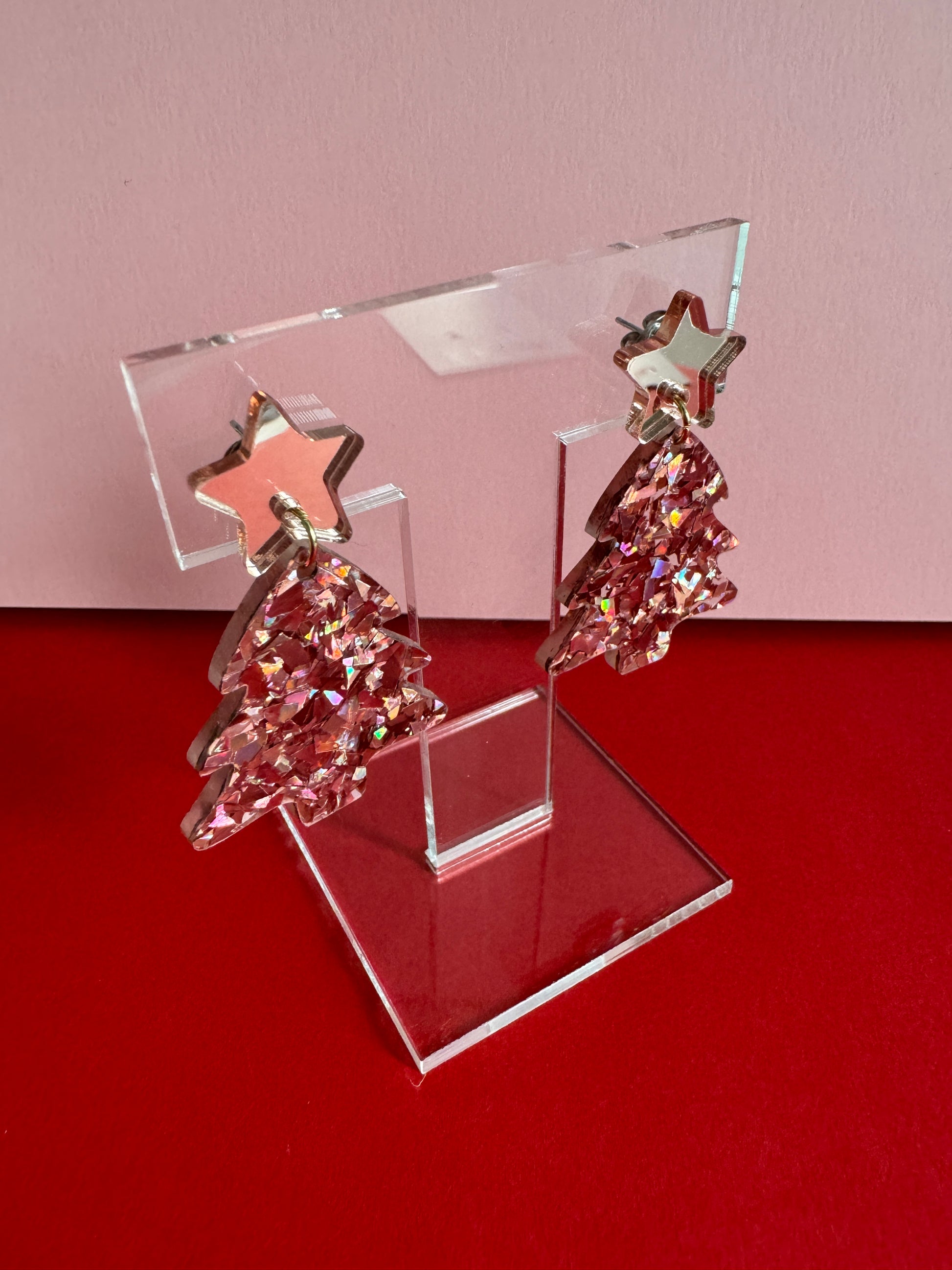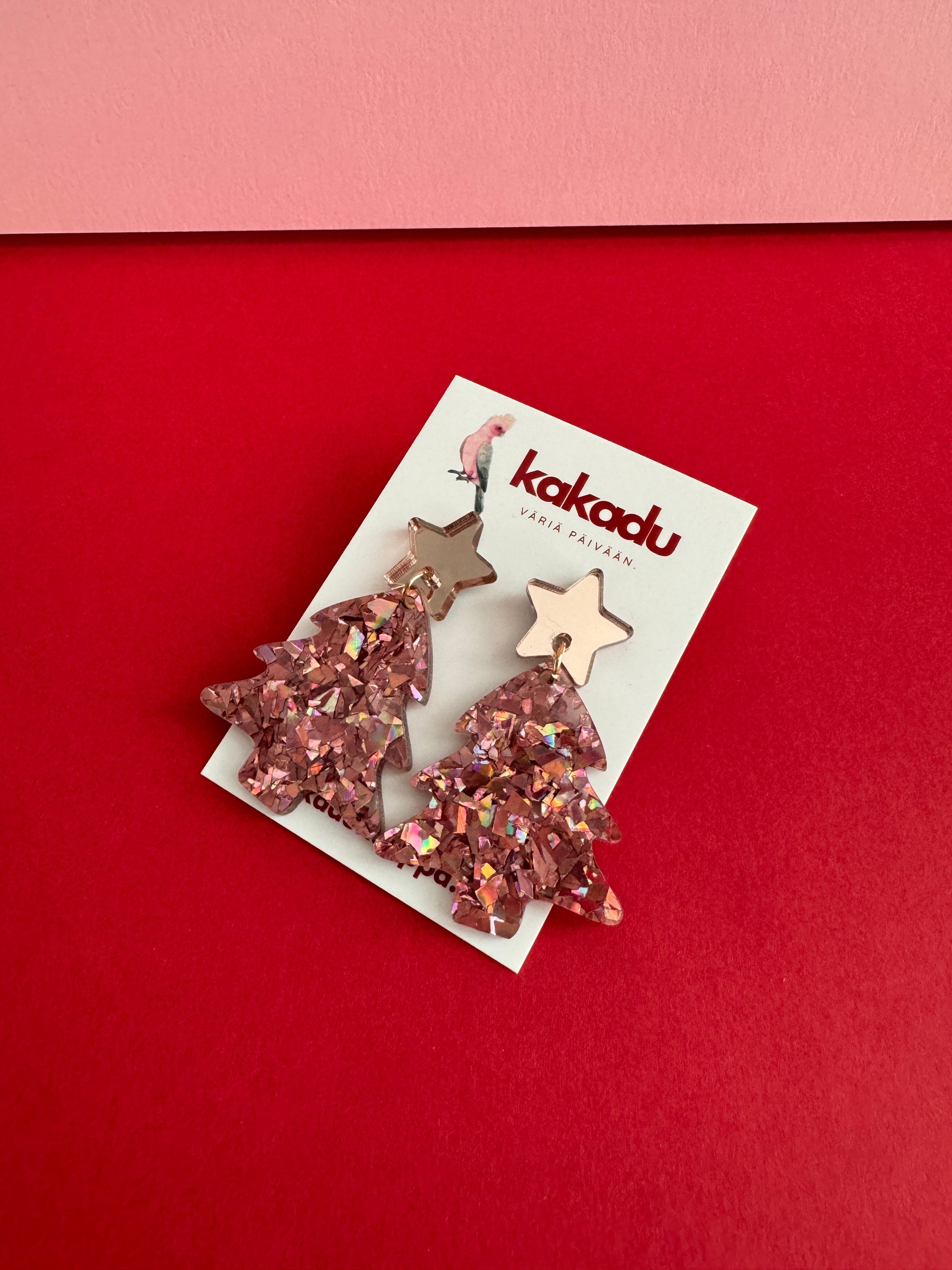 Roikkuvat joulukuusen muotoiset korvakorut. Nappina on ruusukultainen peiliakryylitähti. Joulukuusi on sekoitus rouheaa ruusukultaista glitteriä. Osat on kiinnitetty toisiinsa 18k kullalla pinnoitetulla renkaalla. Kooltaan näyttävät, mutta silti sopusuhtaiset korvissa ja kevyet korvakorut käyttää. Yksivärisyytensä ansiosta helppo yhdistää moneen.