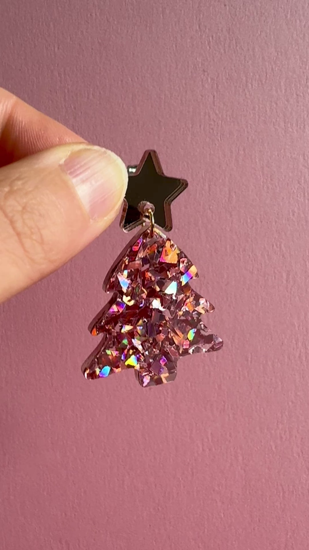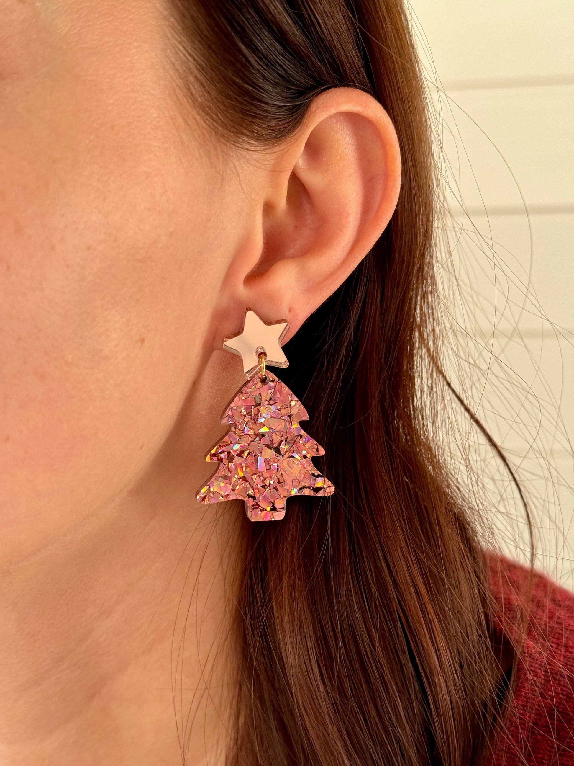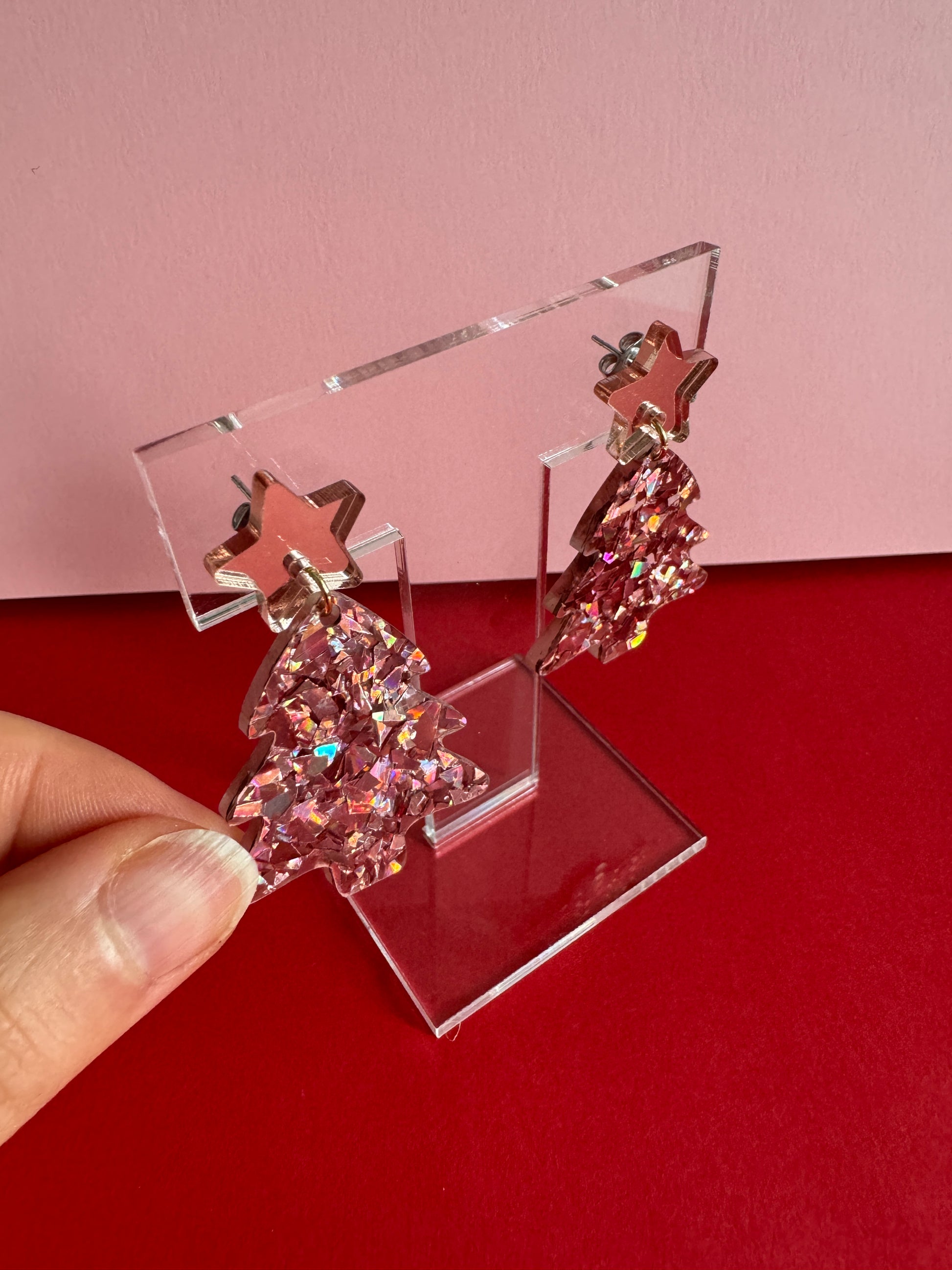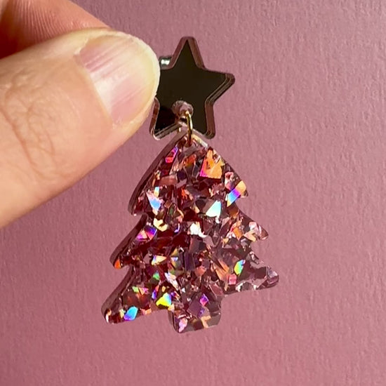 Roikkuvat joulukuusen muotoiset korvakorut. Nappina on ruusukultainen peiliakryylitähti. Joulukuusi on sekoitus rouheaa ruusukultaista glitteriä. Osat on kiinnitetty toisiinsa 18k kullalla pinnoitetulla renkaalla. Kooltaan näyttävät, mutta silti sopusuhtaiset korvissa ja kevyet korvakorut käyttää. Yksivärisyytensä ansiosta helppo yhdistää moneen.