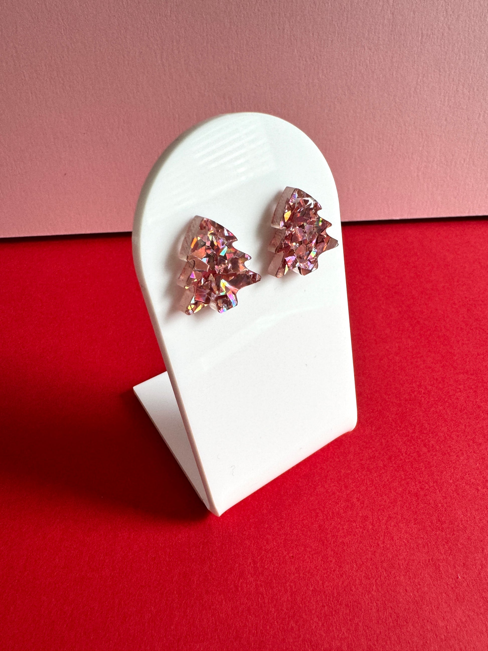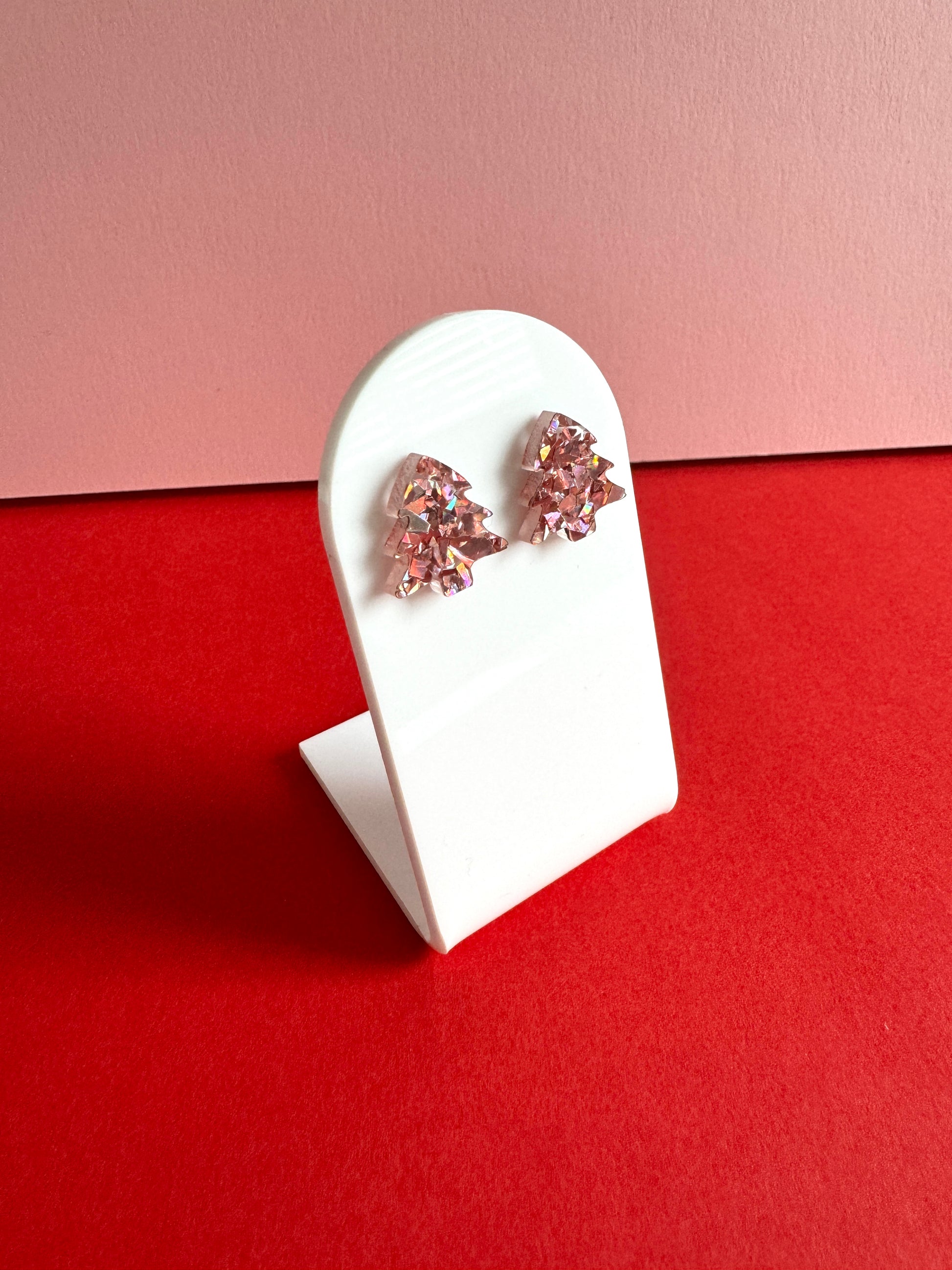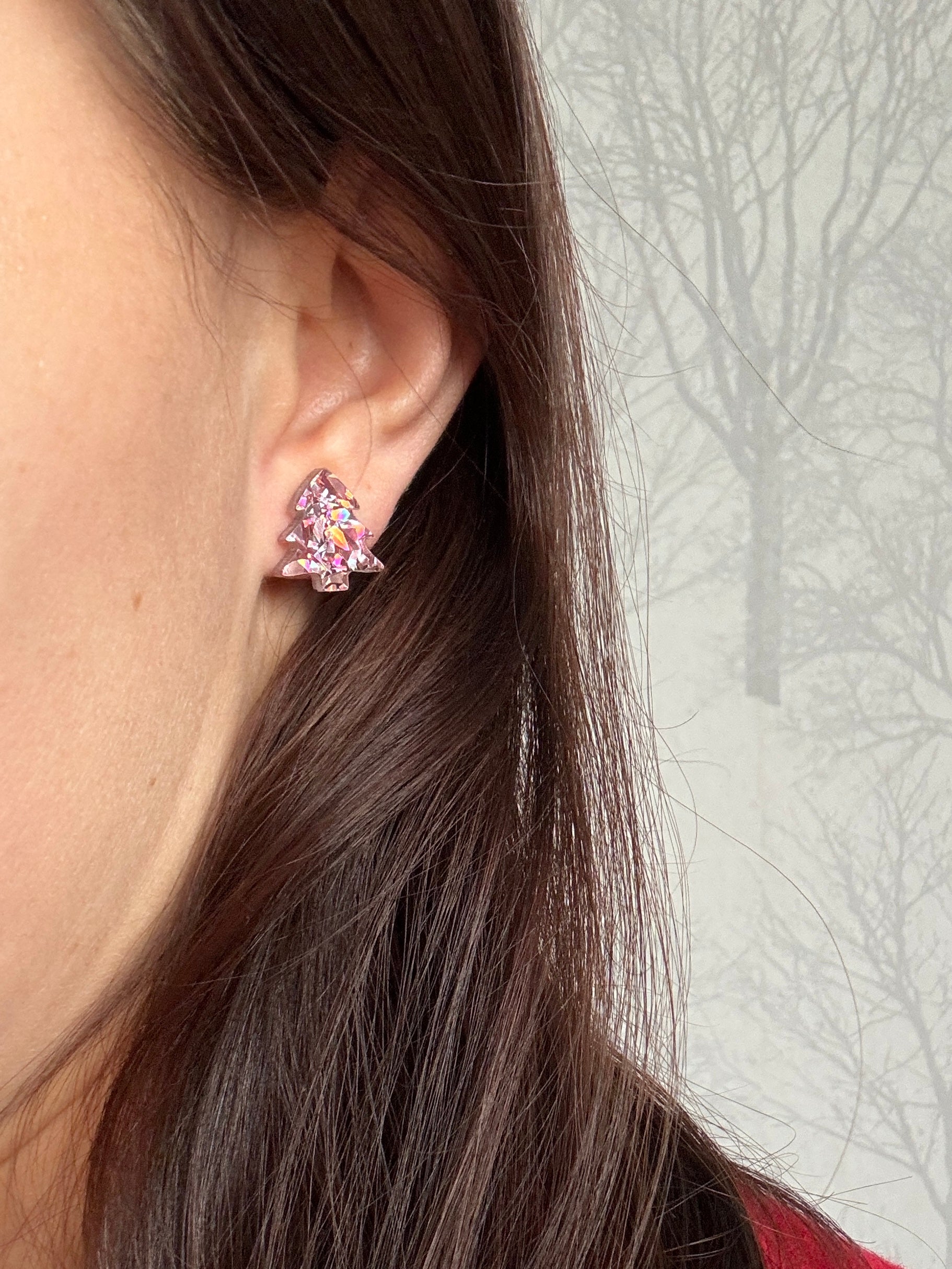 Joulukuusen muotoiset nappikorvakorut. Värinä ruusukullan värinen sekoitus rouheaa glitteriä.