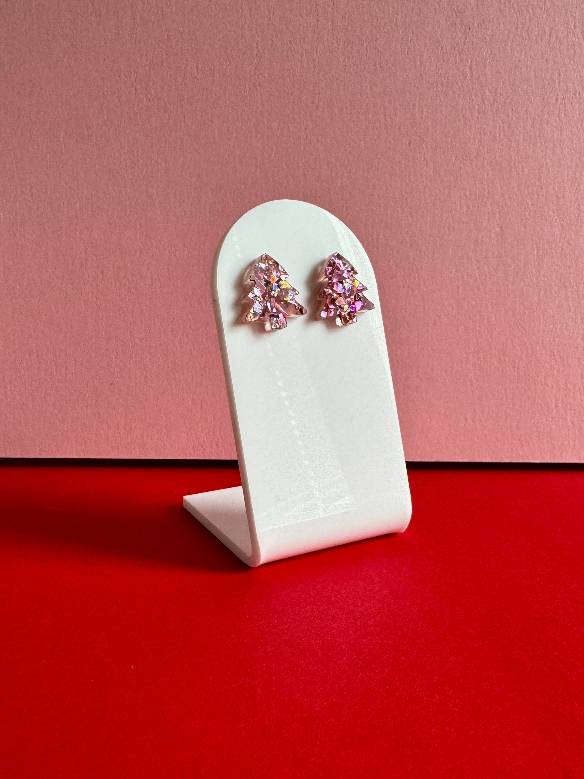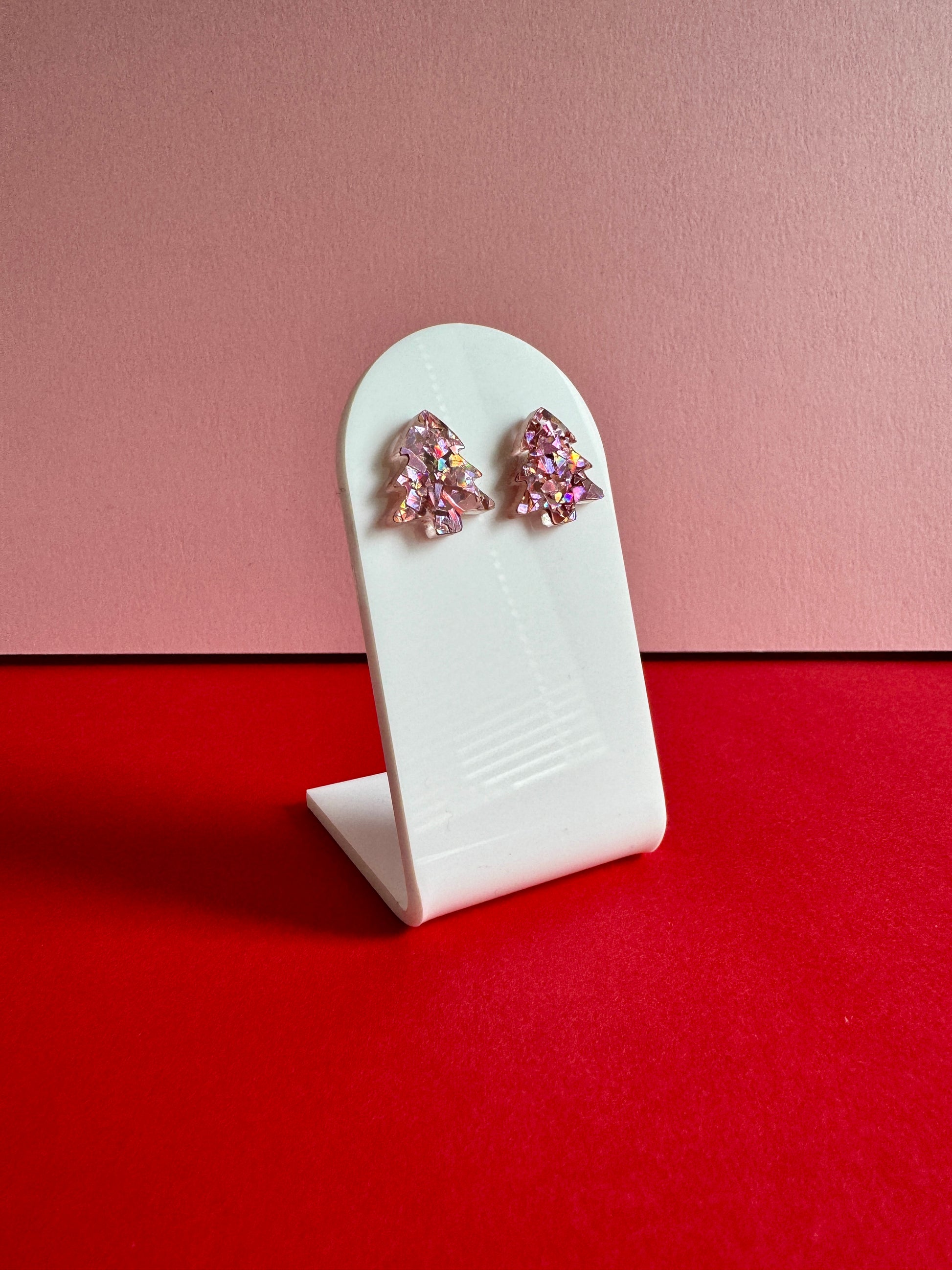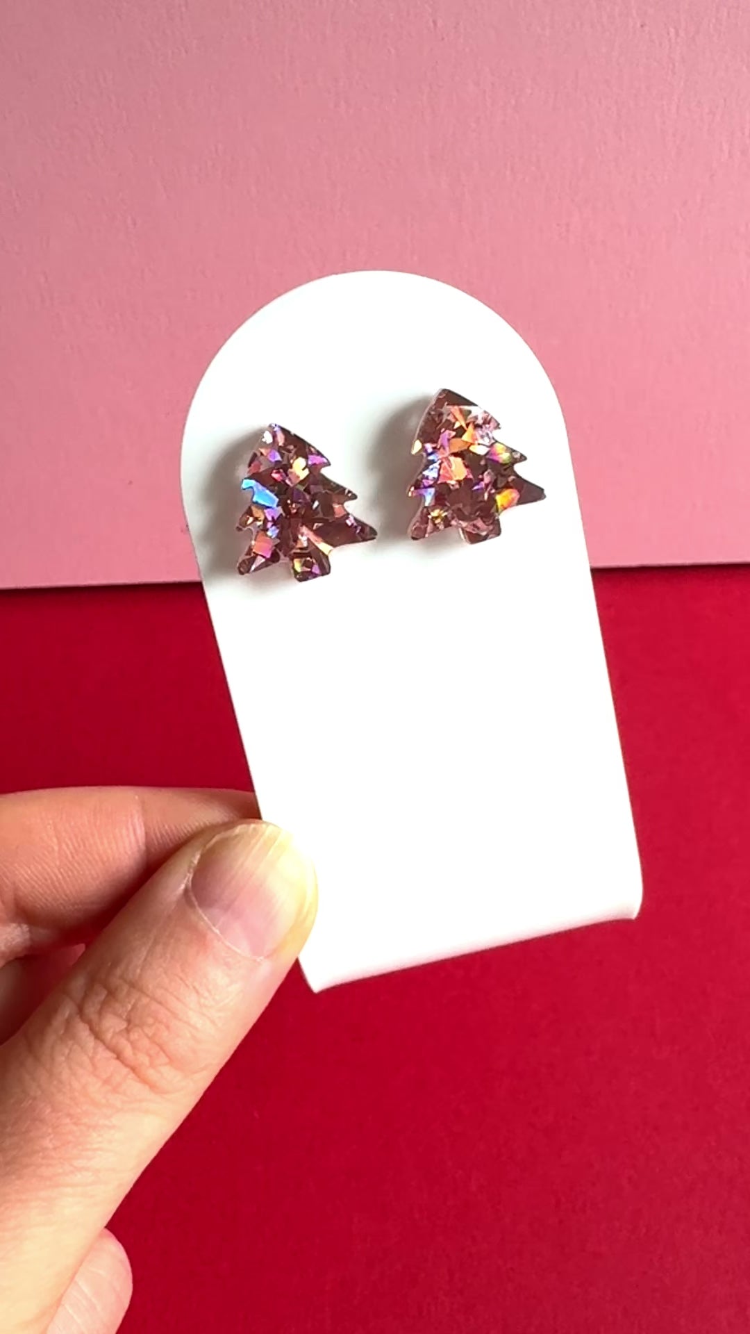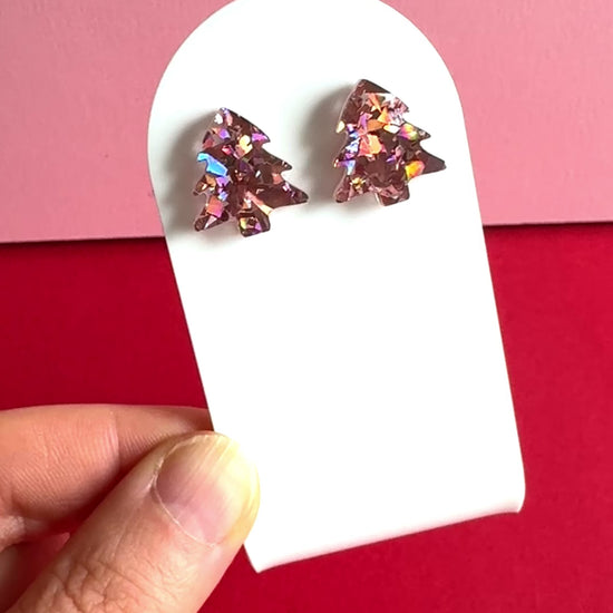 Joulukuusen muotoiset nappikorvakorut. Värinä ruusukullan värinen sekoitus rouheaa glitteriä.