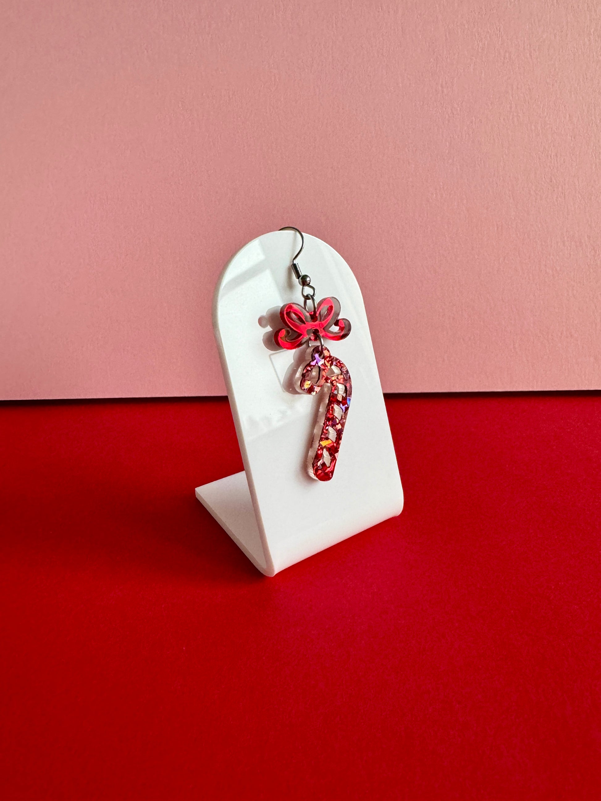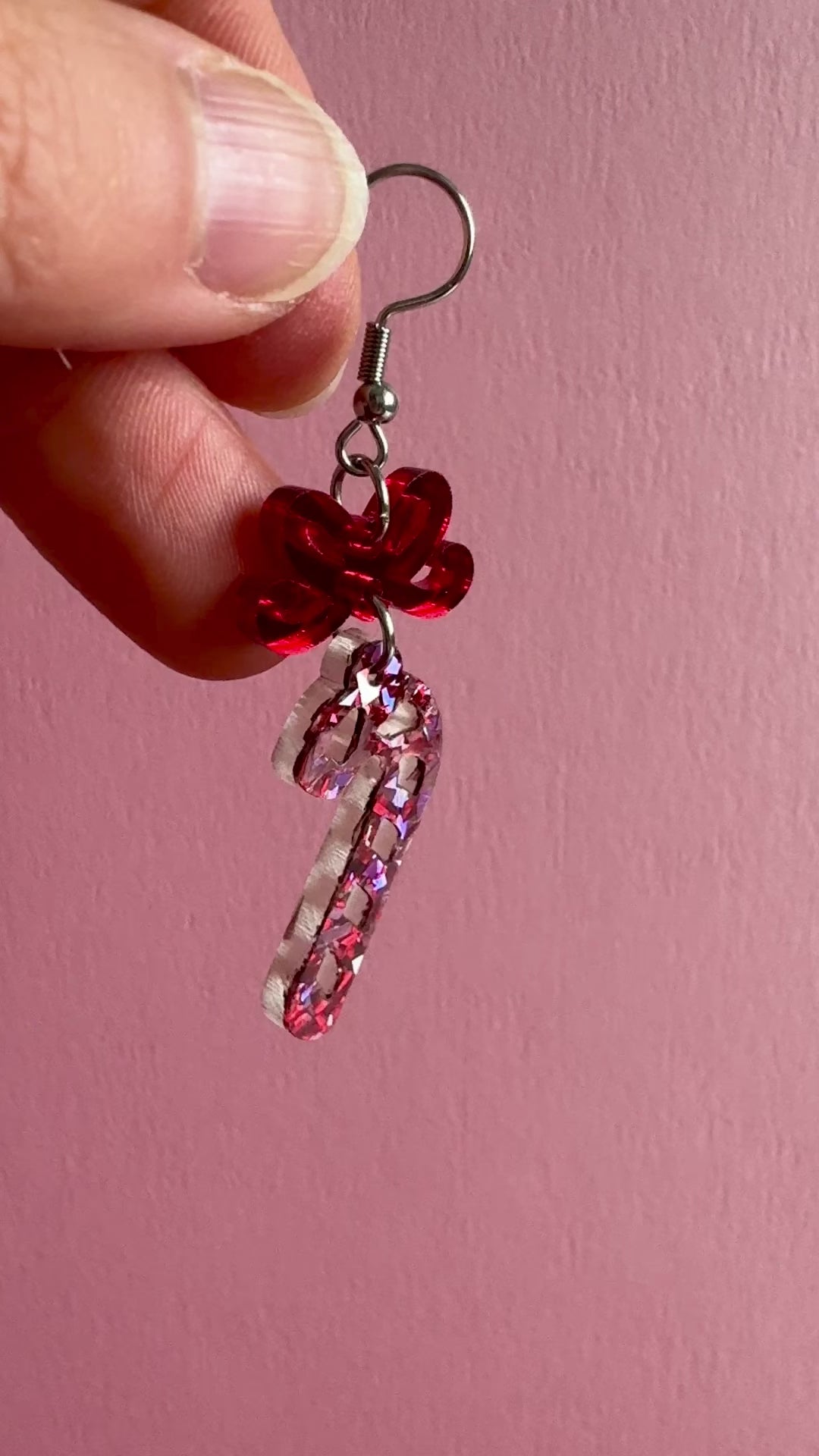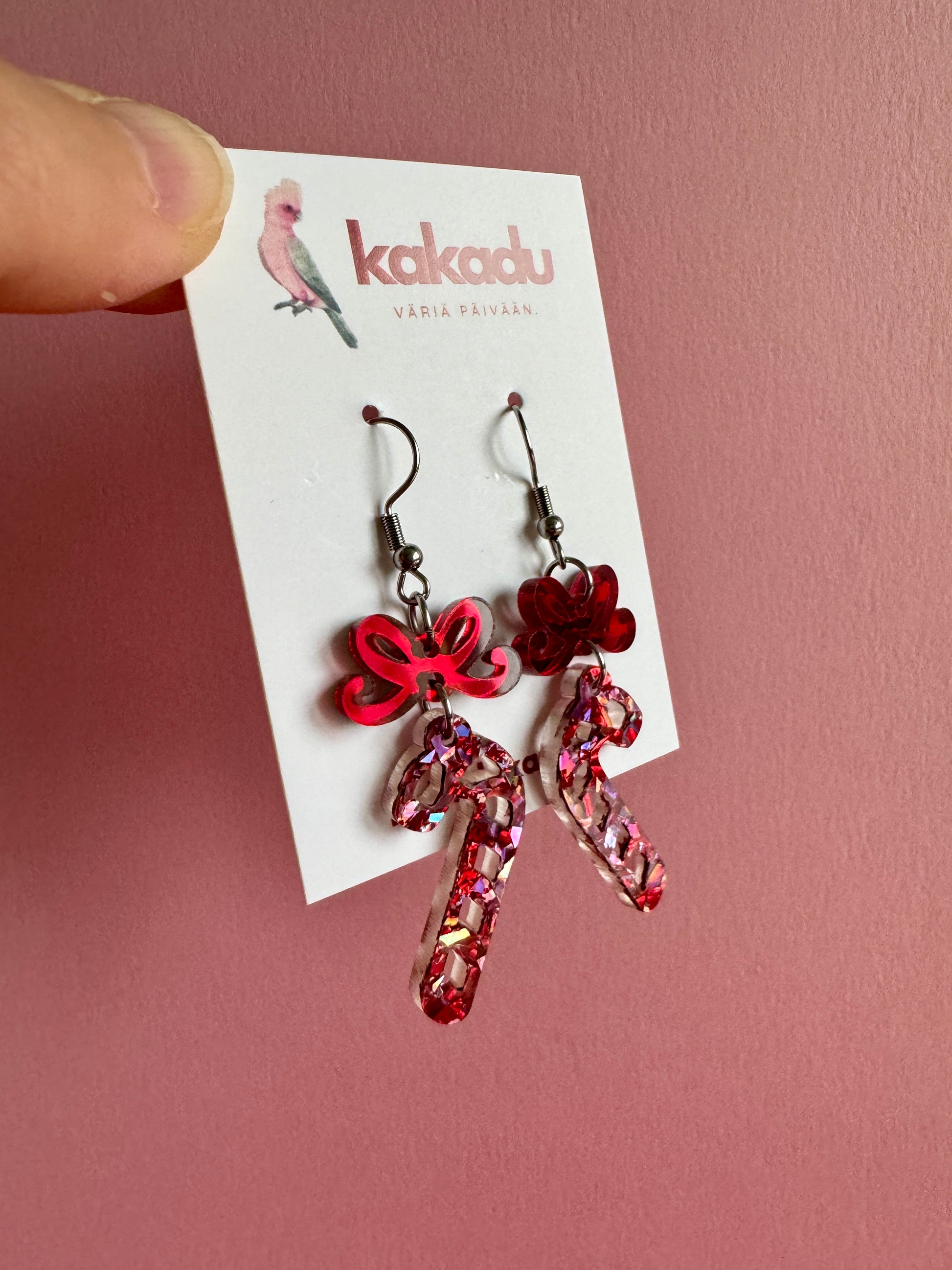 Roikkuvat karkkikeppikorvakorut koukkukiinnityksellä. Rusetti on punaista peiliakryylia ja karkkikeppi on upeasti yhteensopivaa glittersekoitusta punaisen eri sävyissä. Palat on yhdistetty toisiinsa hopeanvärisillä metalliosilla. Ilmankevyet roikkuvat korvakorut, jotka koukkujen ansiosta liikkuvat eloisasti. Punainen ja kimallus sopivat kauniisti jouluun.
