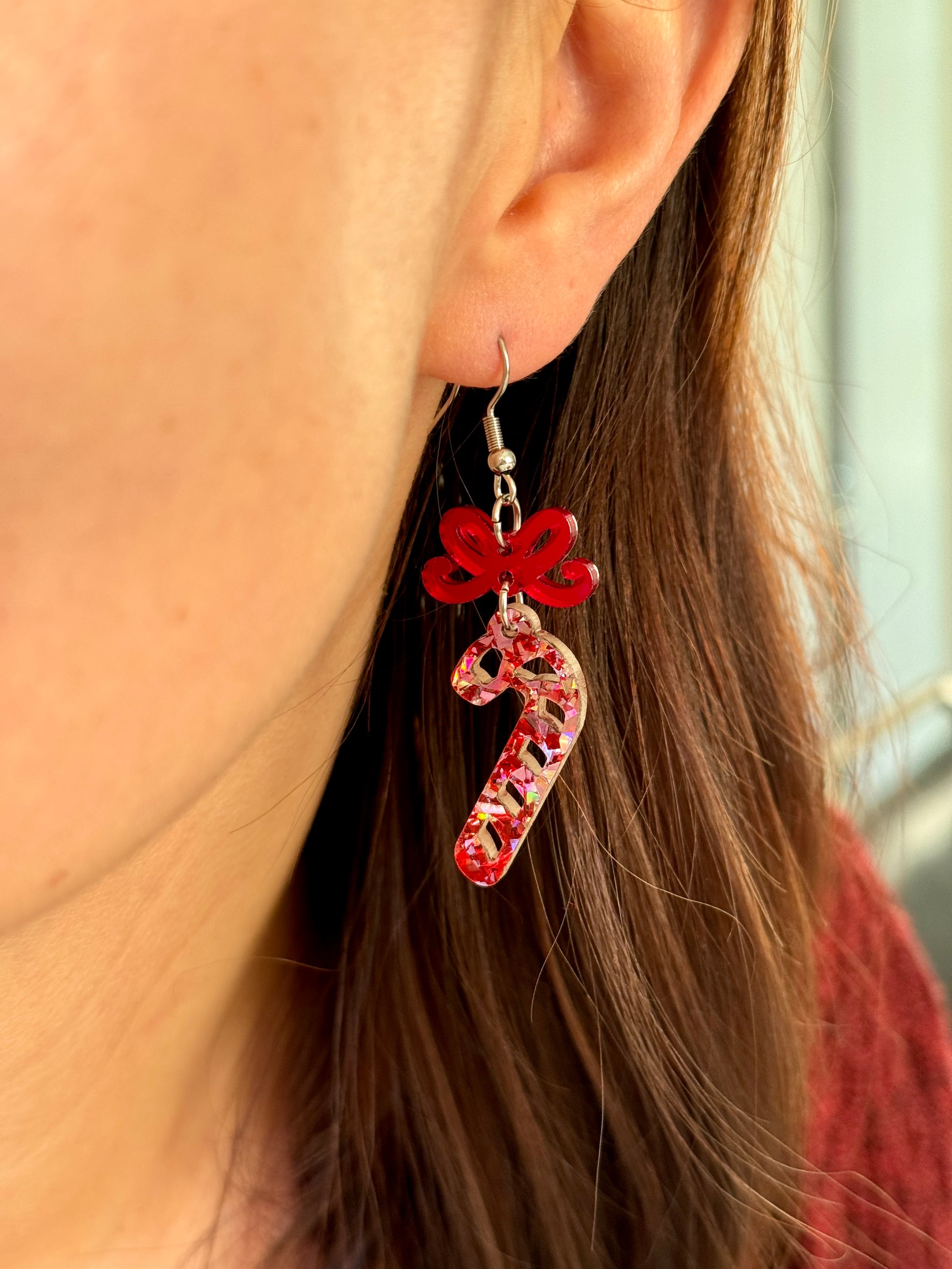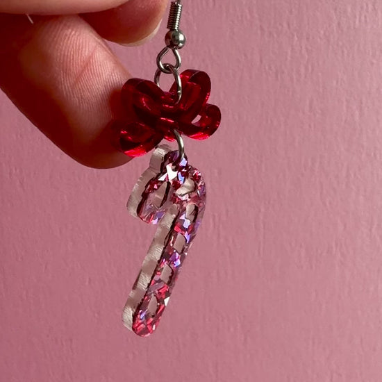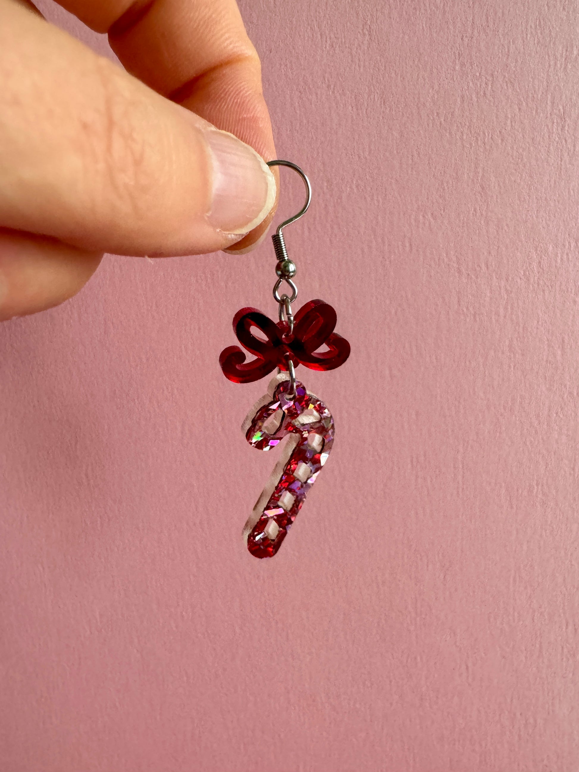 Roikkuvat karkkikeppikorvakorut koukkukiinnityksellä. Rusetti on punaista peiliakryylia ja karkkikeppi on upeasti yhteensopivaa glittersekoitusta punaisen eri sävyissä. Palat on yhdistetty toisiinsa hopeanvärisillä metalliosilla. Ilmankevyet roikkuvat korvakorut, jotka koukkujen ansiosta liikkuvat eloisasti. Punainen ja kimallus sopivat kauniisti jouluun.