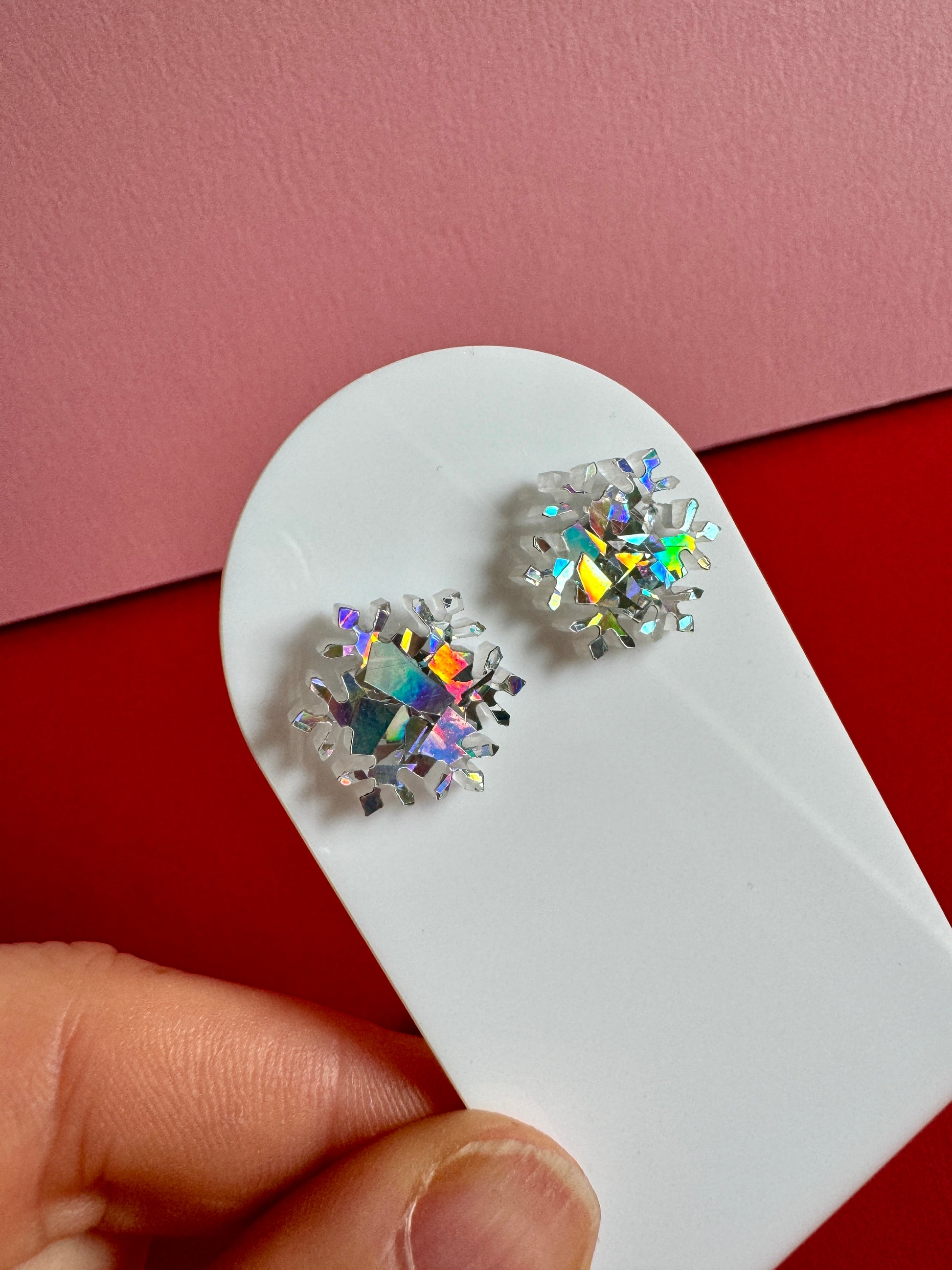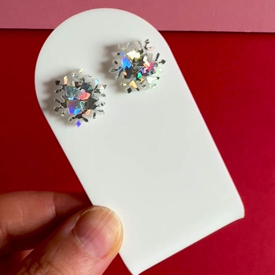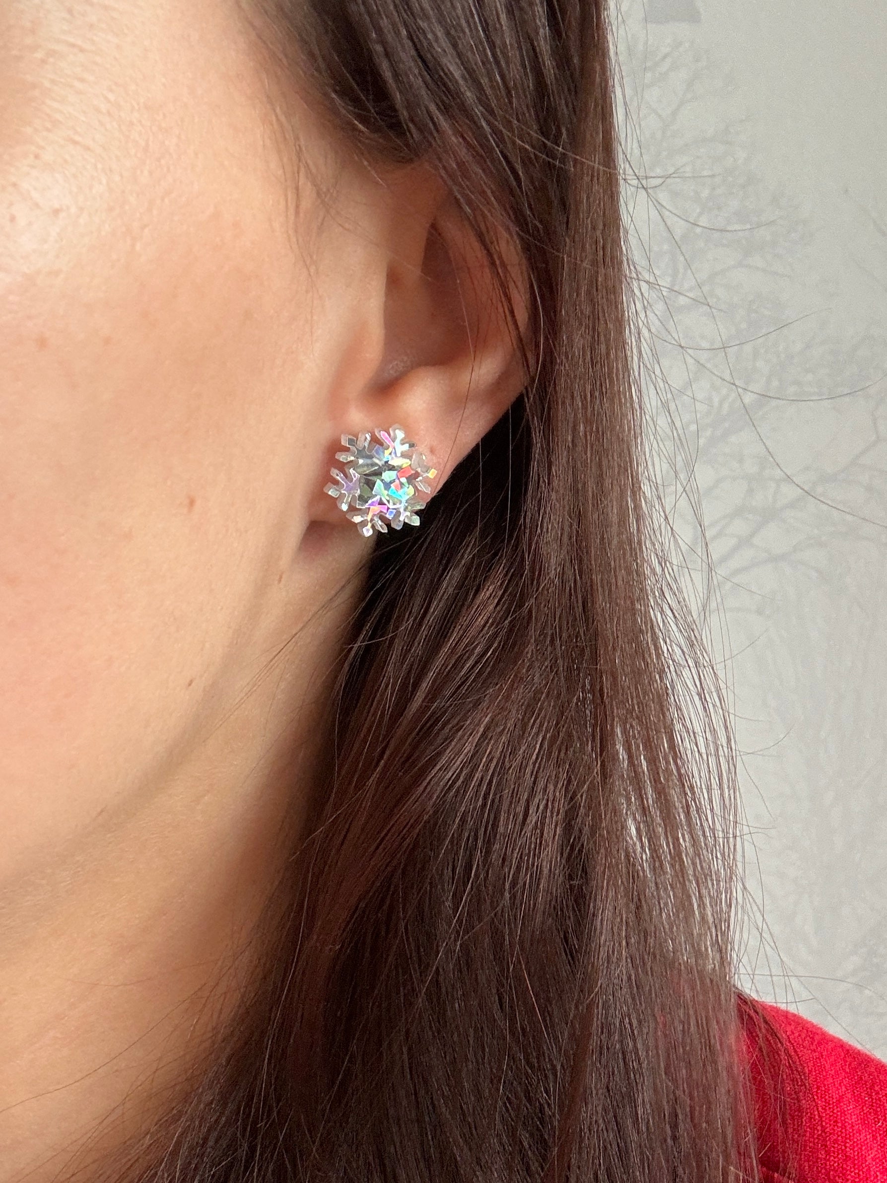 Lumihiutaleen muotoiset nappikorvakorut. Värinä kauniisti valossa kimalteleva disco, joka on sekoitus hopeista rouheaa glitteriä. Täydelliset korvikset jouluun ja talveen.