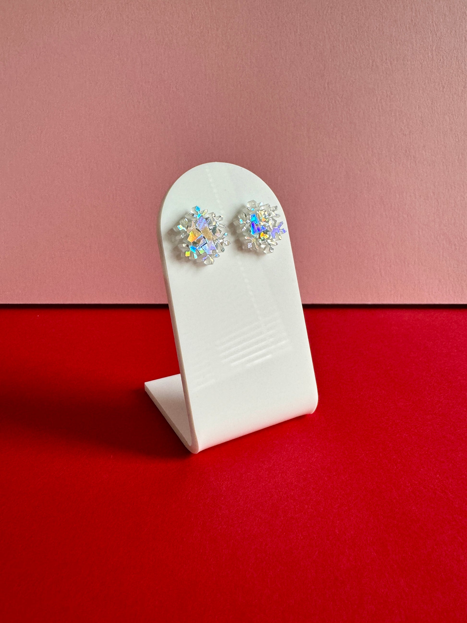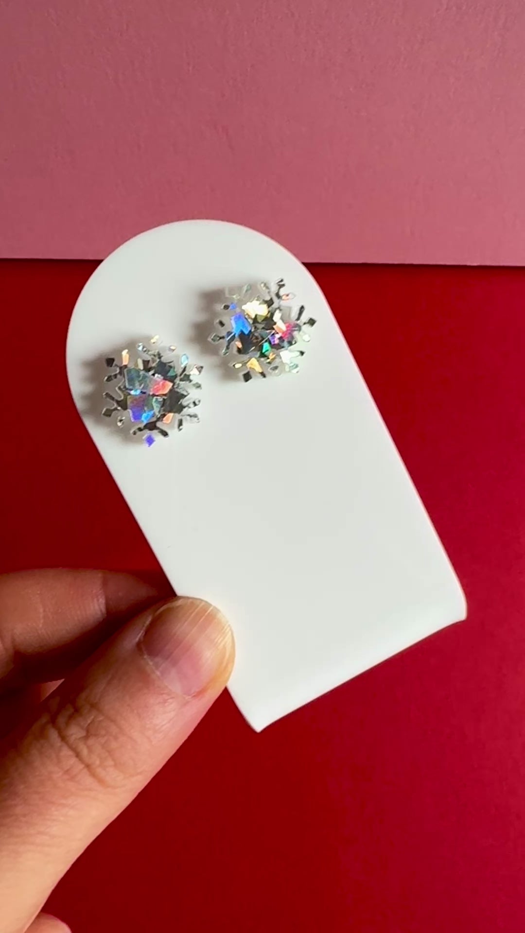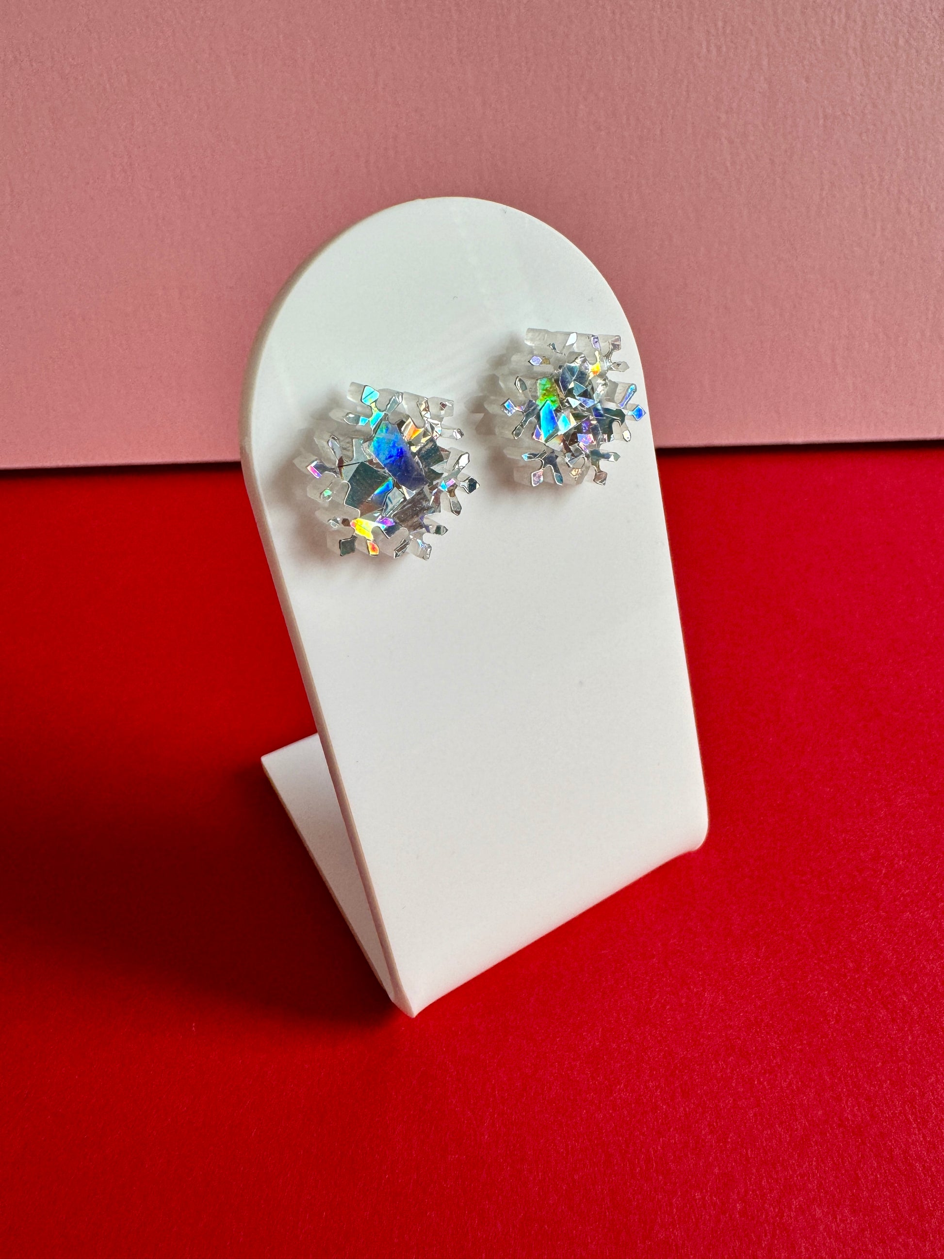 Lumihiutaleen muotoiset nappikorvakorut. Värinä kauniisti valossa kimalteleva disco, joka on sekoitus hopeista rouheaa glitteriä. Täydelliset korvikset jouluun ja talveen.