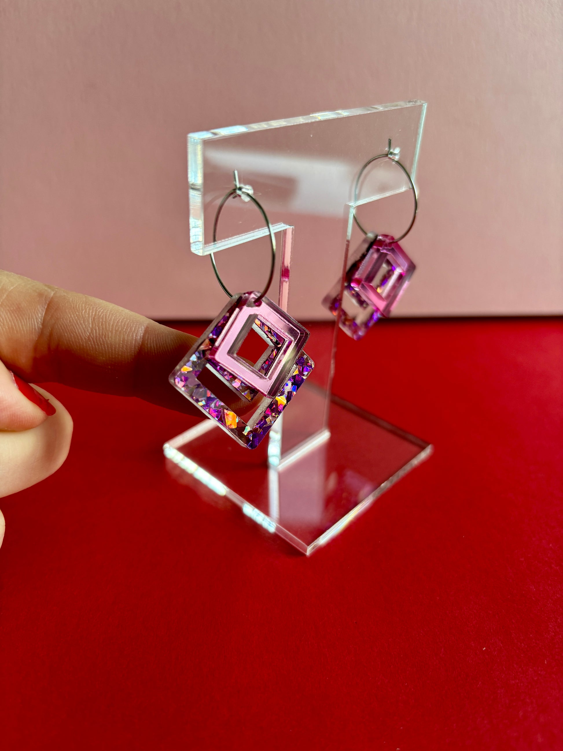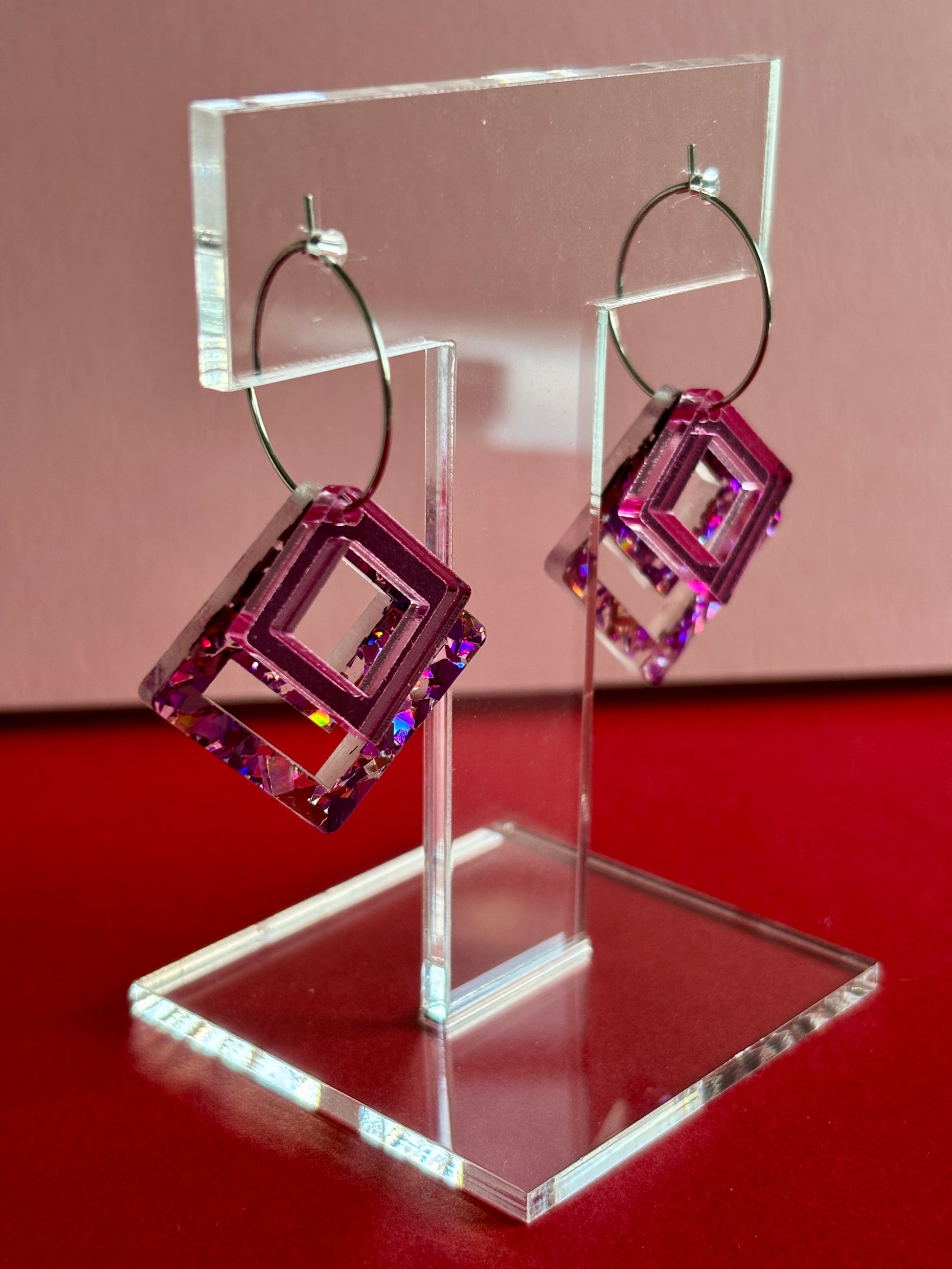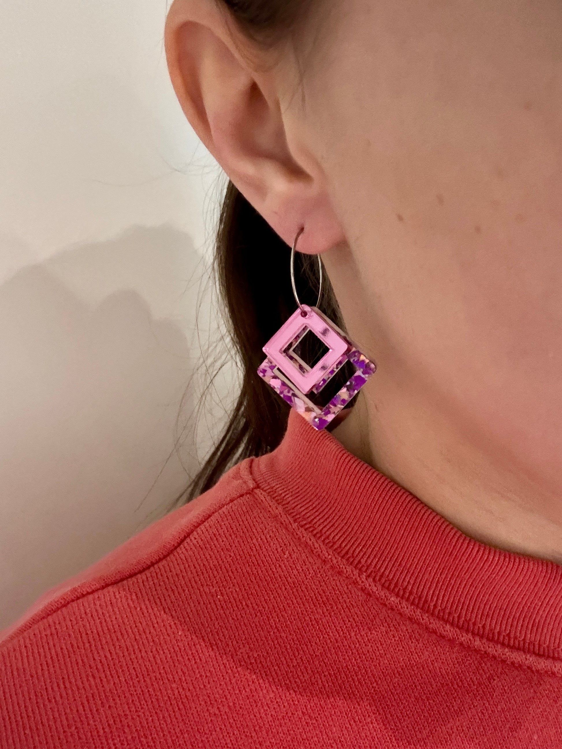 Macrame-korvakorut ovat näyttävät korvakorut, jotka keräävät katseita. Rengaskiinnitys salli tehdä korvakorut, joissa osat ovat päällekkäin ja luovat eri kokojensa ja väriensä ansiosta hauskan kerroksellisuuden. Alla on macrame-neliö, joka on sekoitus vaaleanpunaista, violettia ja ruusukultaa. Päällä pienempi neliö vaaleanpunaista peiliakryylia.