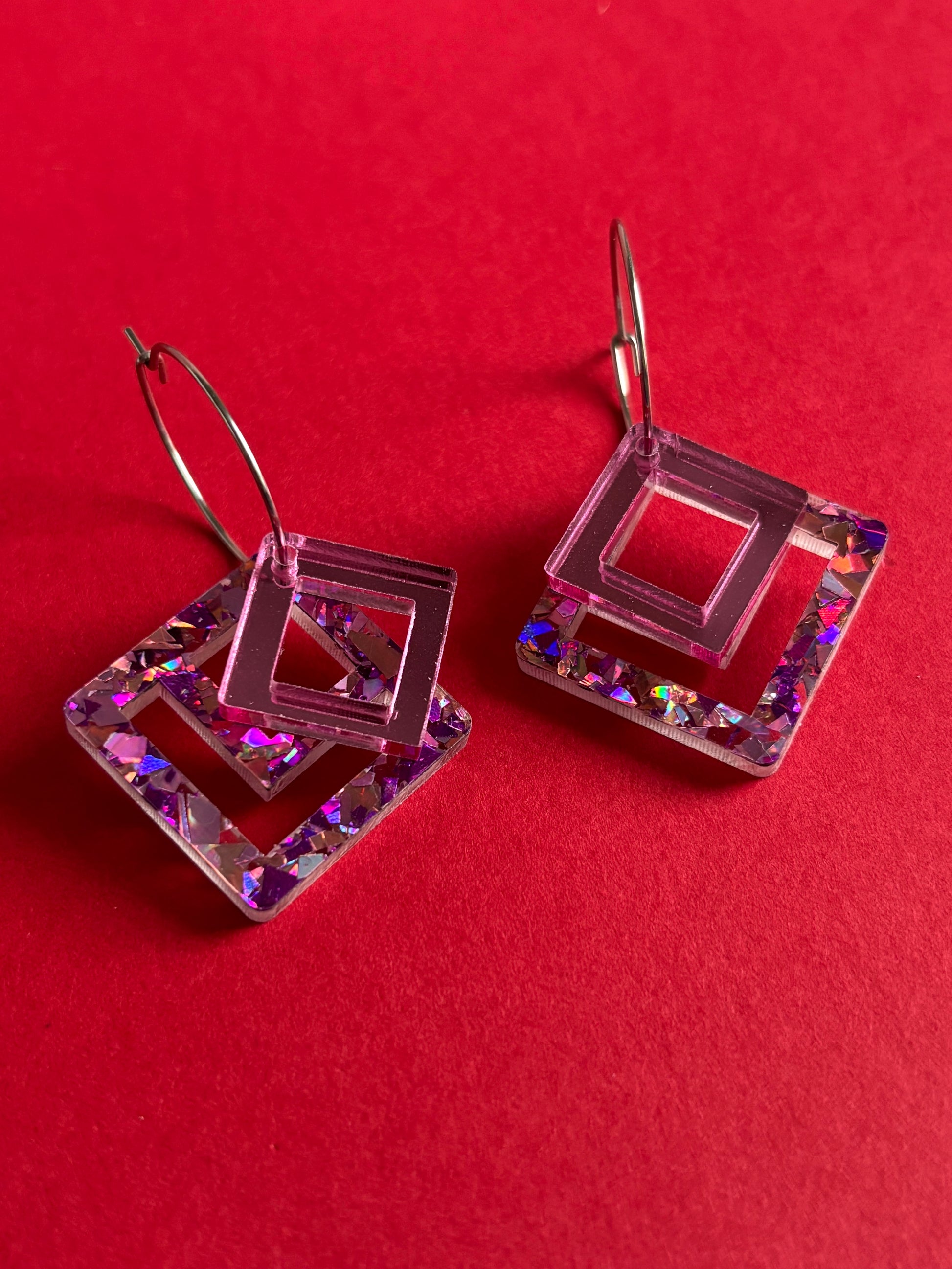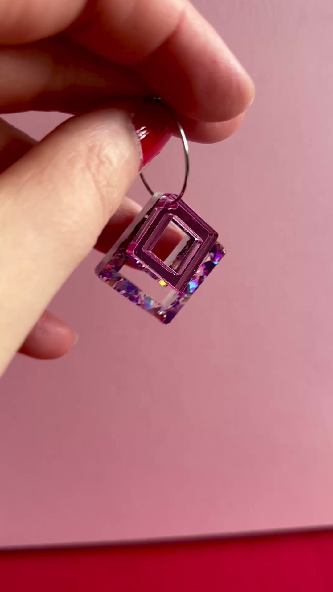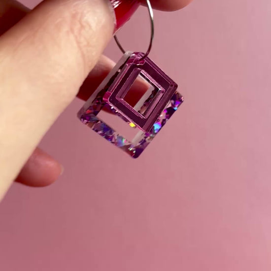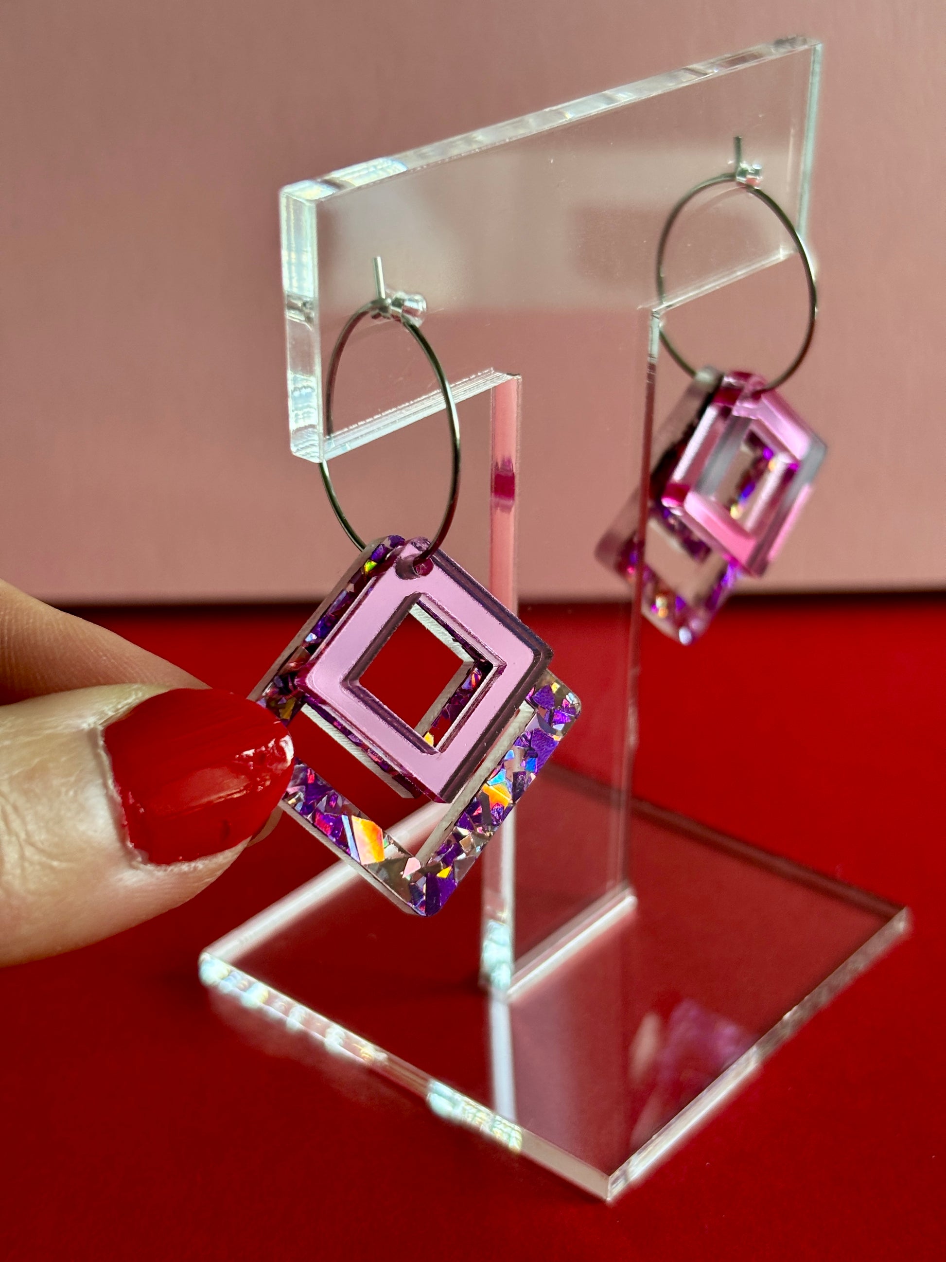 Macrame-korvakorut ovat näyttävät korvakorut, jotka keräävät katseita. Rengaskiinnitys salli tehdä korvakorut, joissa osat ovat päällekkäin ja luovat eri kokojensa ja väriensä ansiosta hauskan kerroksellisuuden. Alla on macrame-neliö, joka on sekoitus vaaleanpunaista, violettia ja ruusukultaa. Päällä pienempi neliö vaaleanpunaista peiliakryylia.
