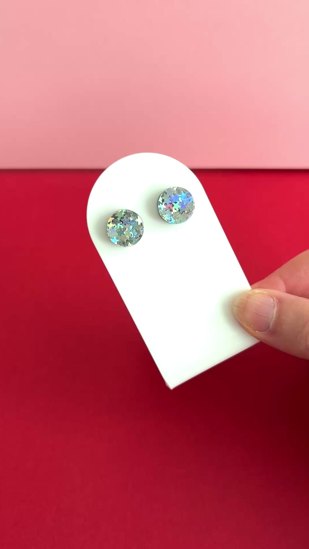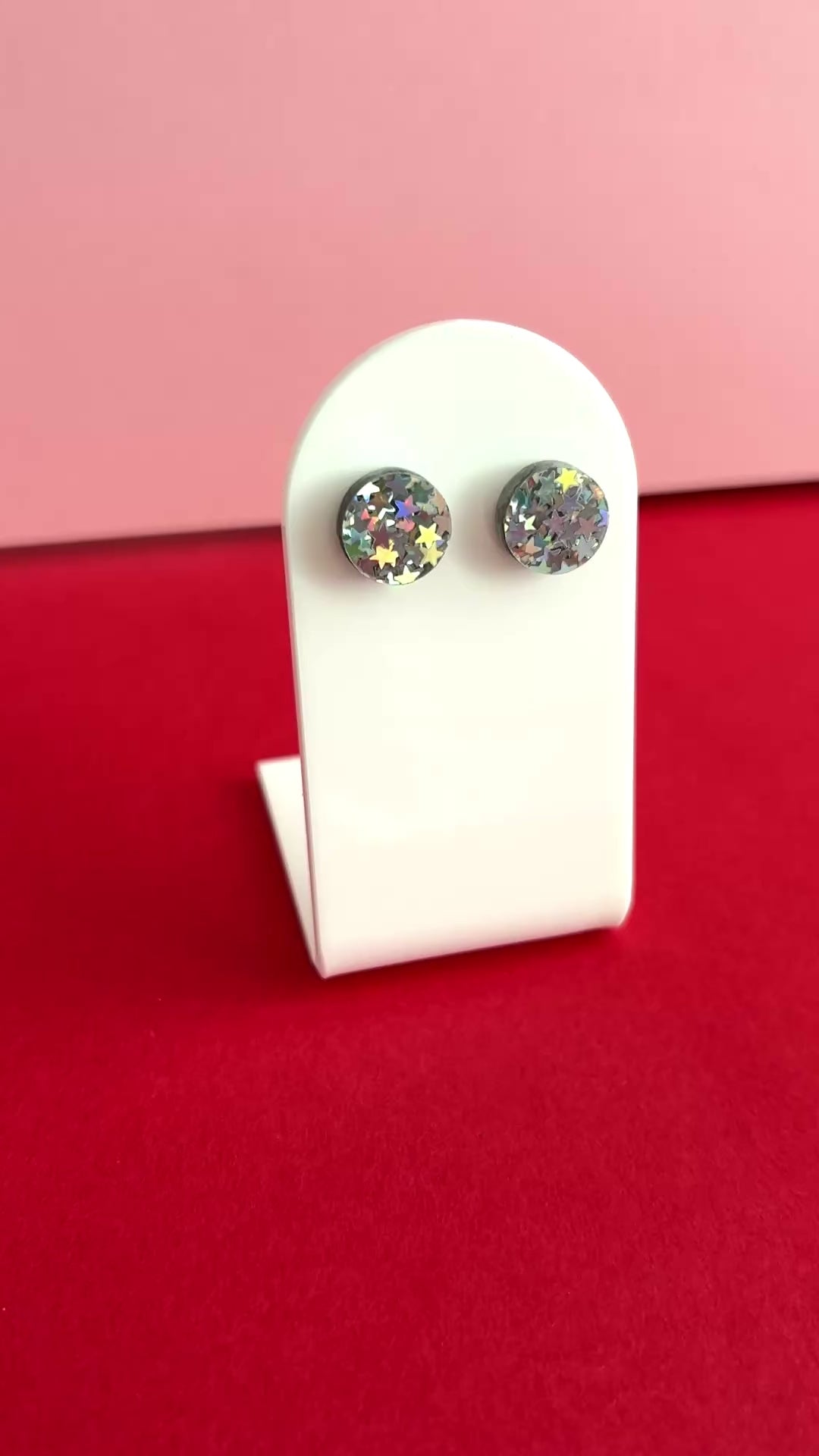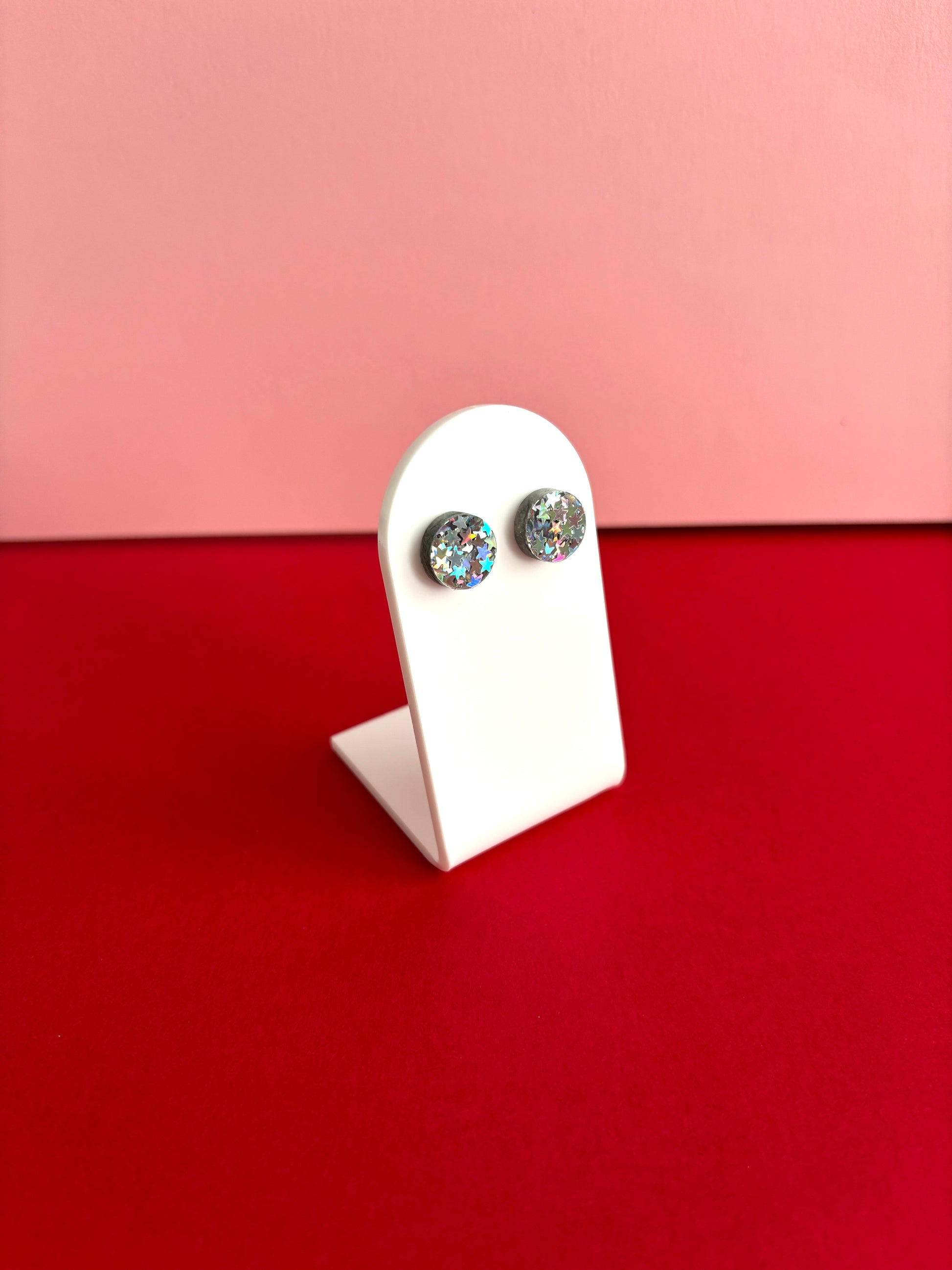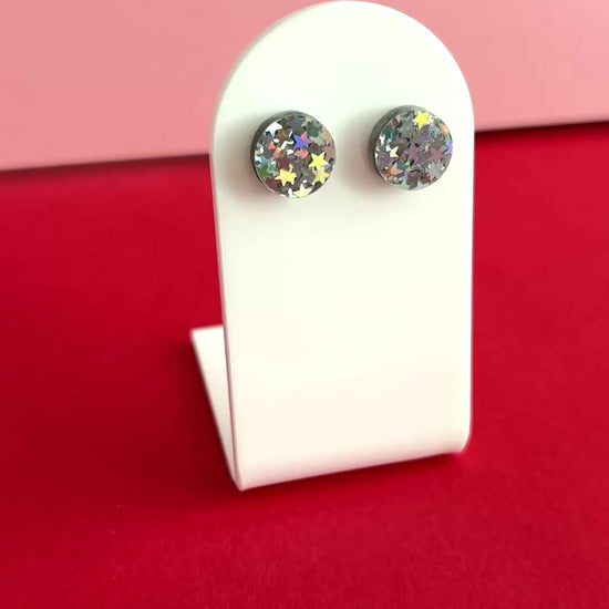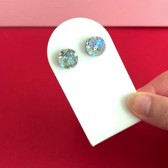 Hei nyt on ihanat nappikorvakorut! Pyöreät nappikorvikset, joissa on sekoitus hopeisia hologrammityyliin kimaltelevia tähtiä. Kokona aavistuksen muita Kakadu-kaupan nappeja pienempi 12 mm, mikä istuu korvalehteen mukavasti. Juuri sopivasti kimallusta kivoilla yksityiskohdilla!