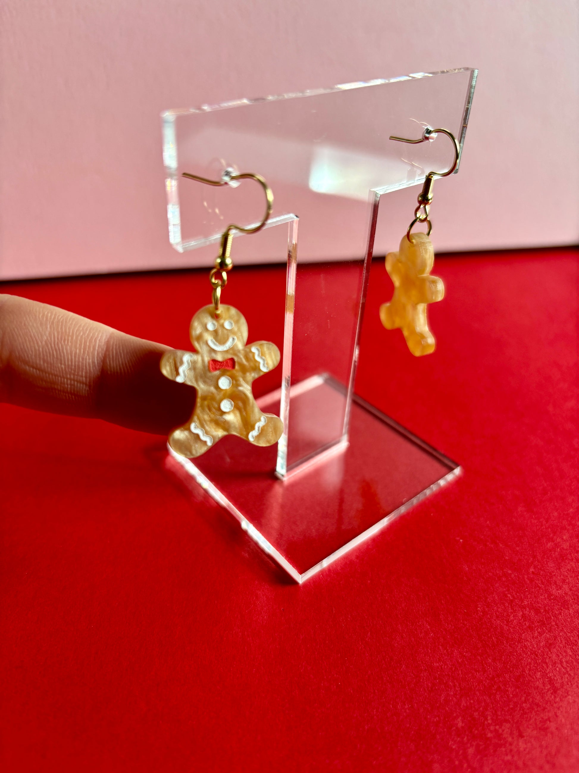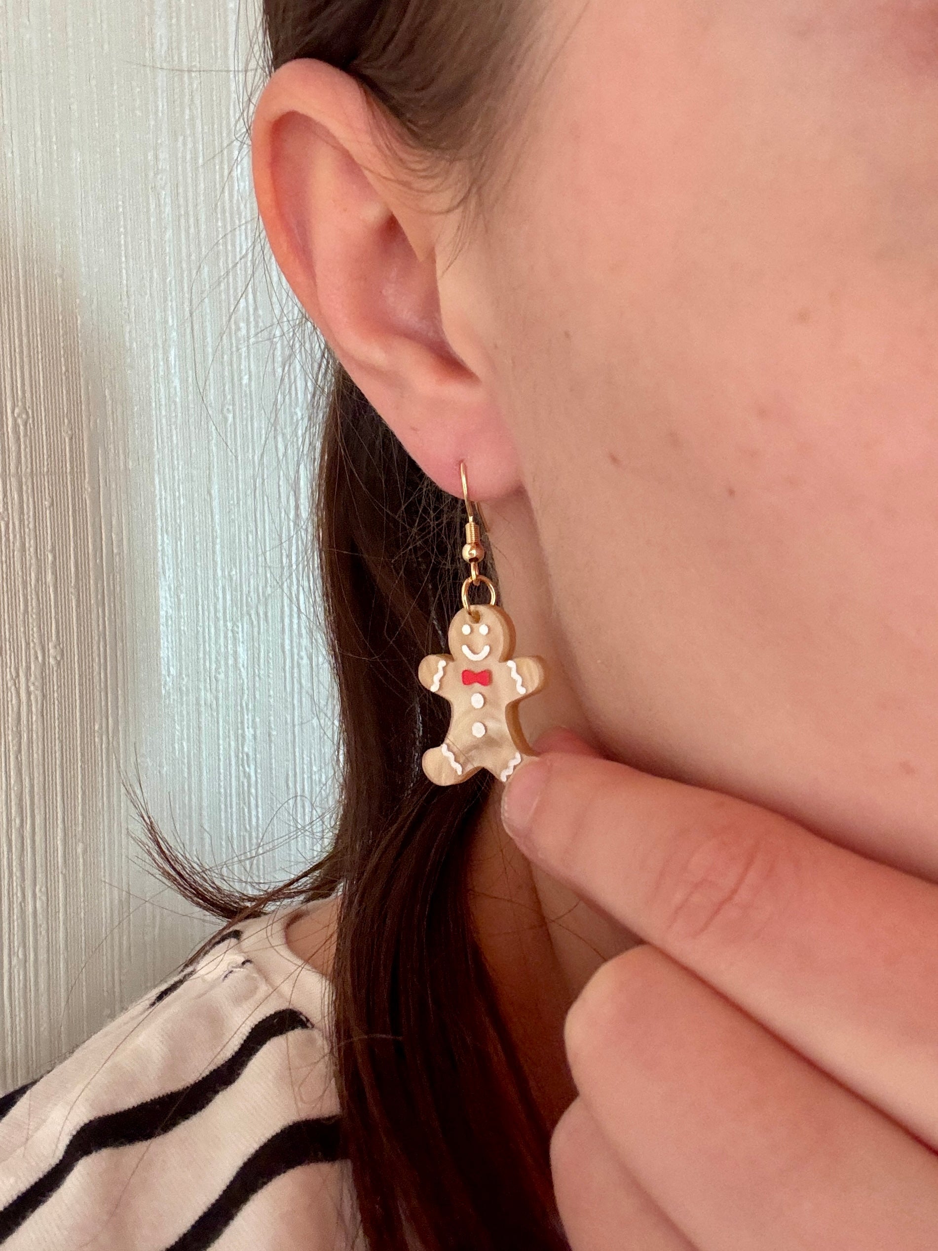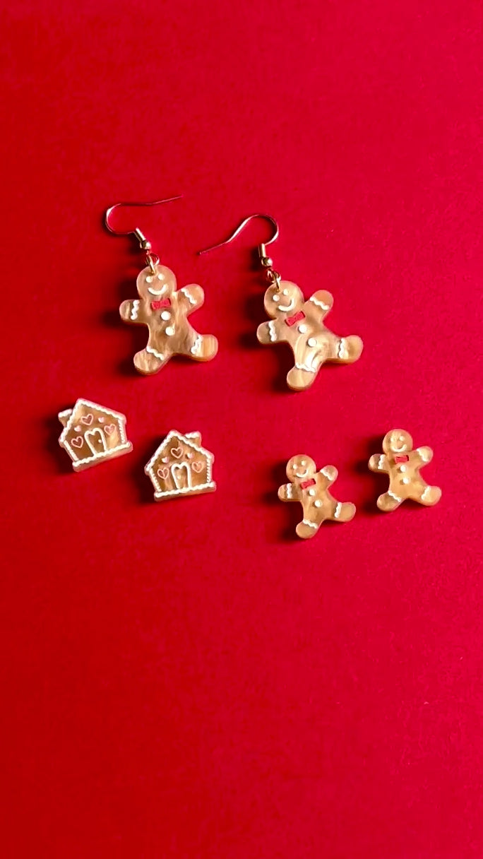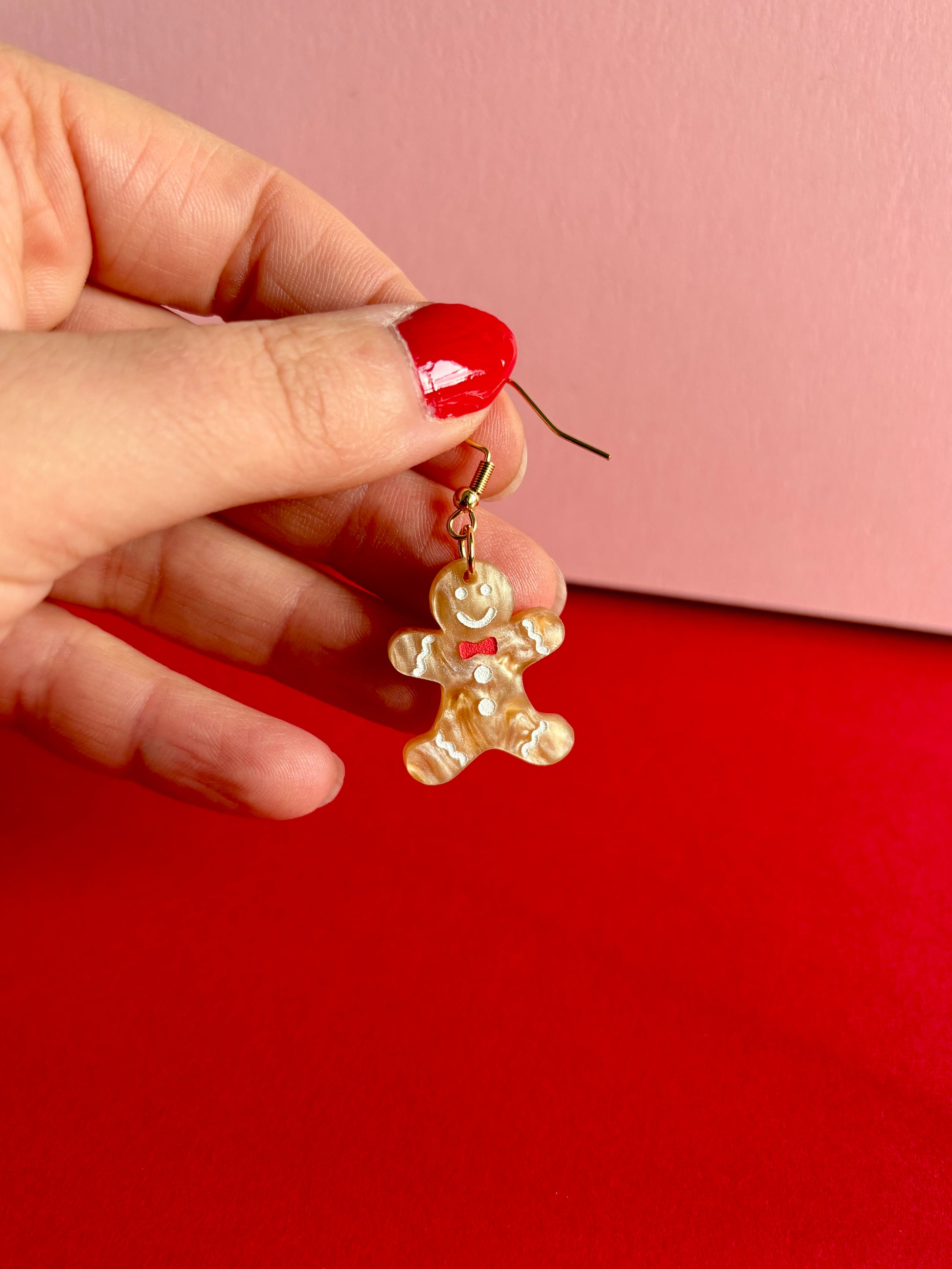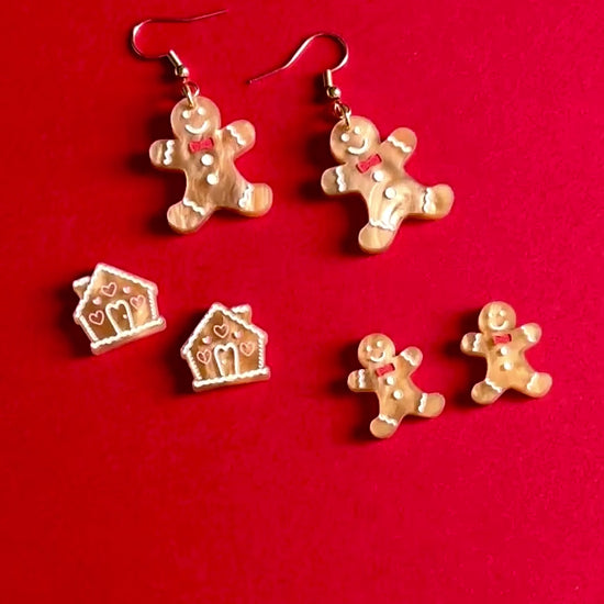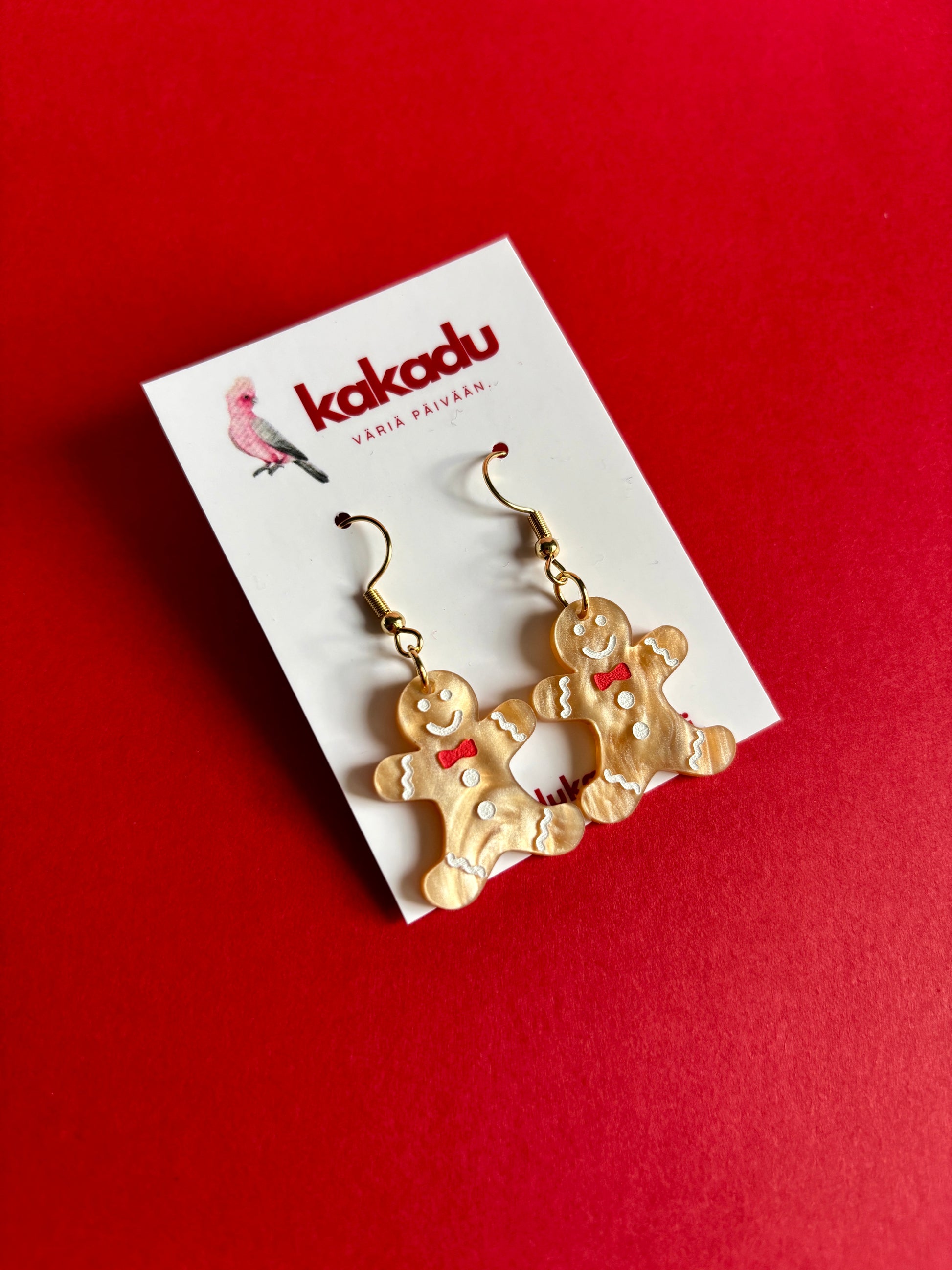 Suloiset pipariukon muotoiset roikkuvat korvakorut. Värinä on kaunis kullanruskea eloisalla pinnalla. Yksityiskohdat eli kuorrutukset on käsinmaalattu valkoisella ja punaisella.