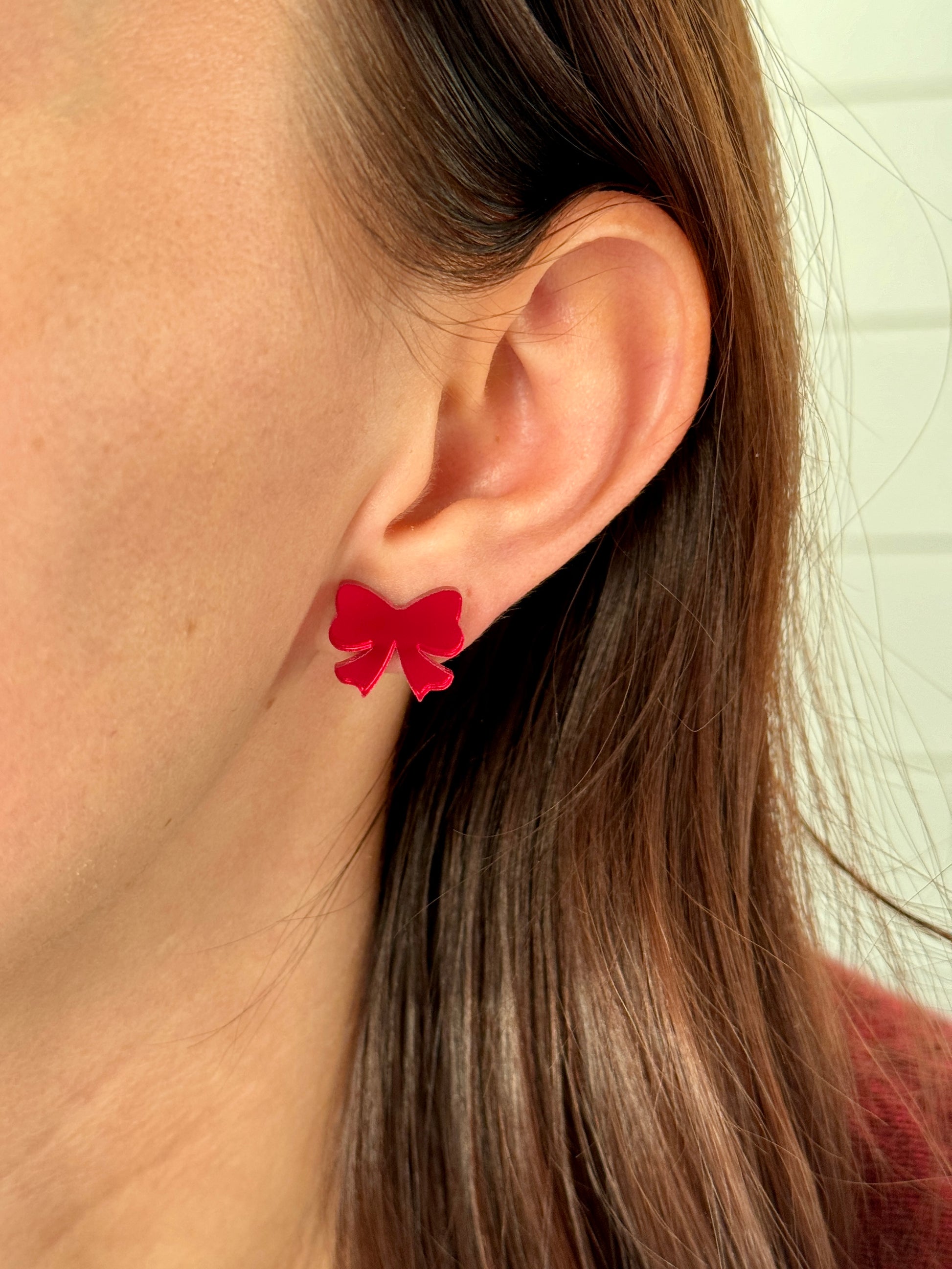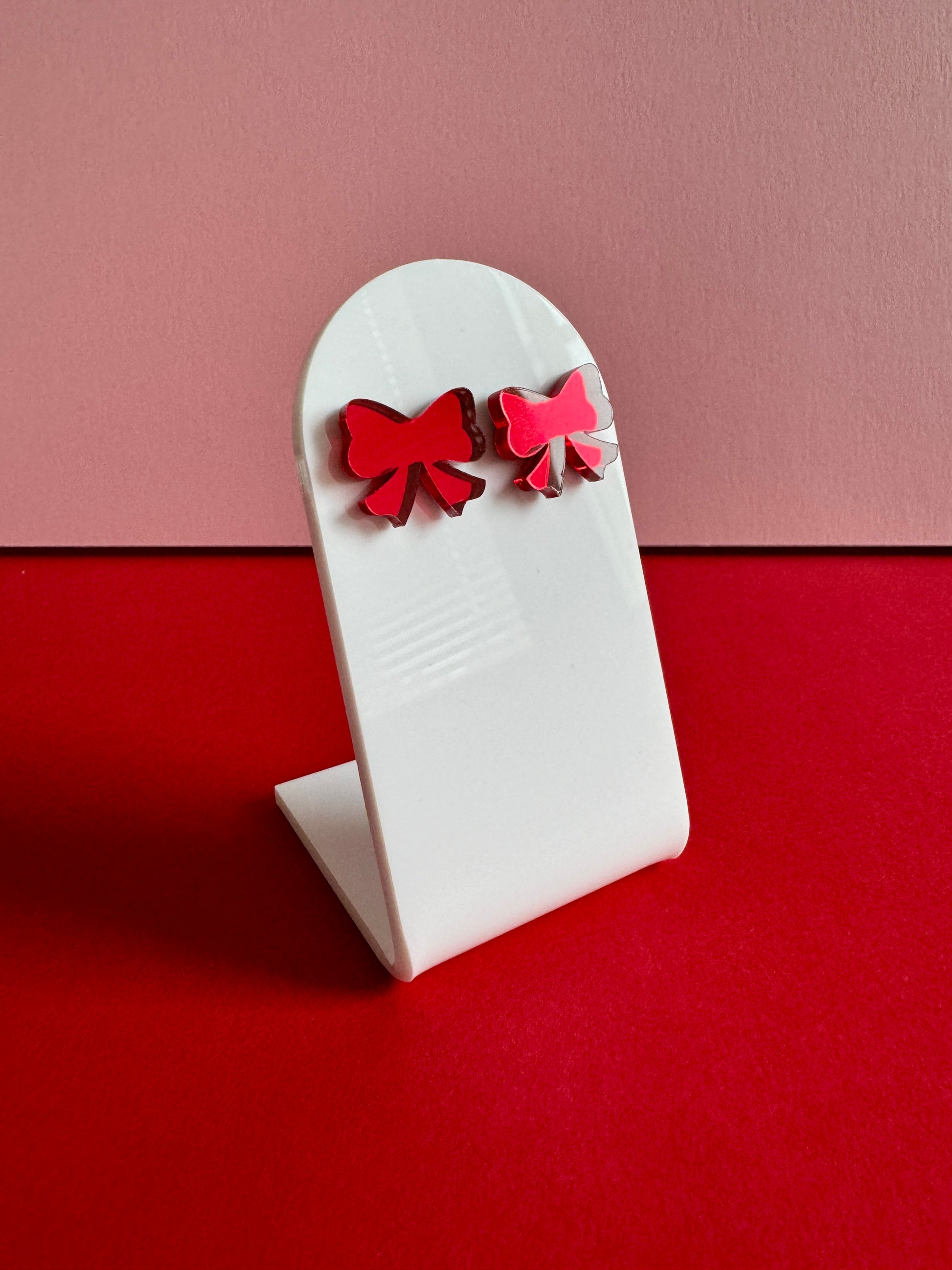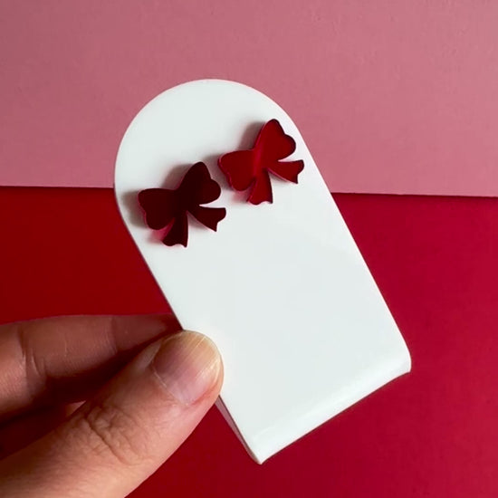 Rusetin muotoiset nappikorvakorut. Todella kaunista tummanpunaista peiliakryylia, joka sopii rusetteihin täydellisesti. Sopii hyvin jouluun ja ympärivuotiseen käyttöön.