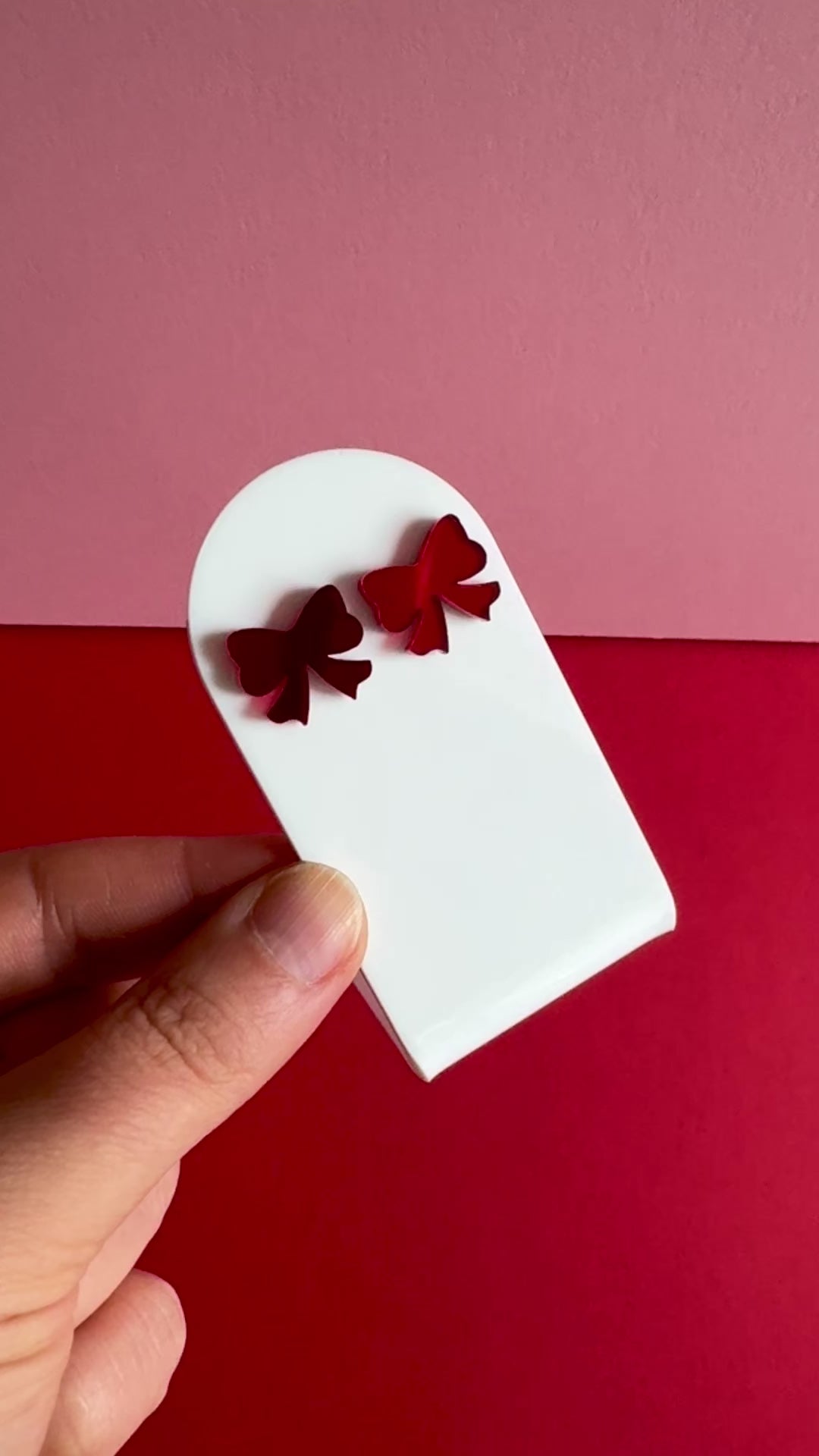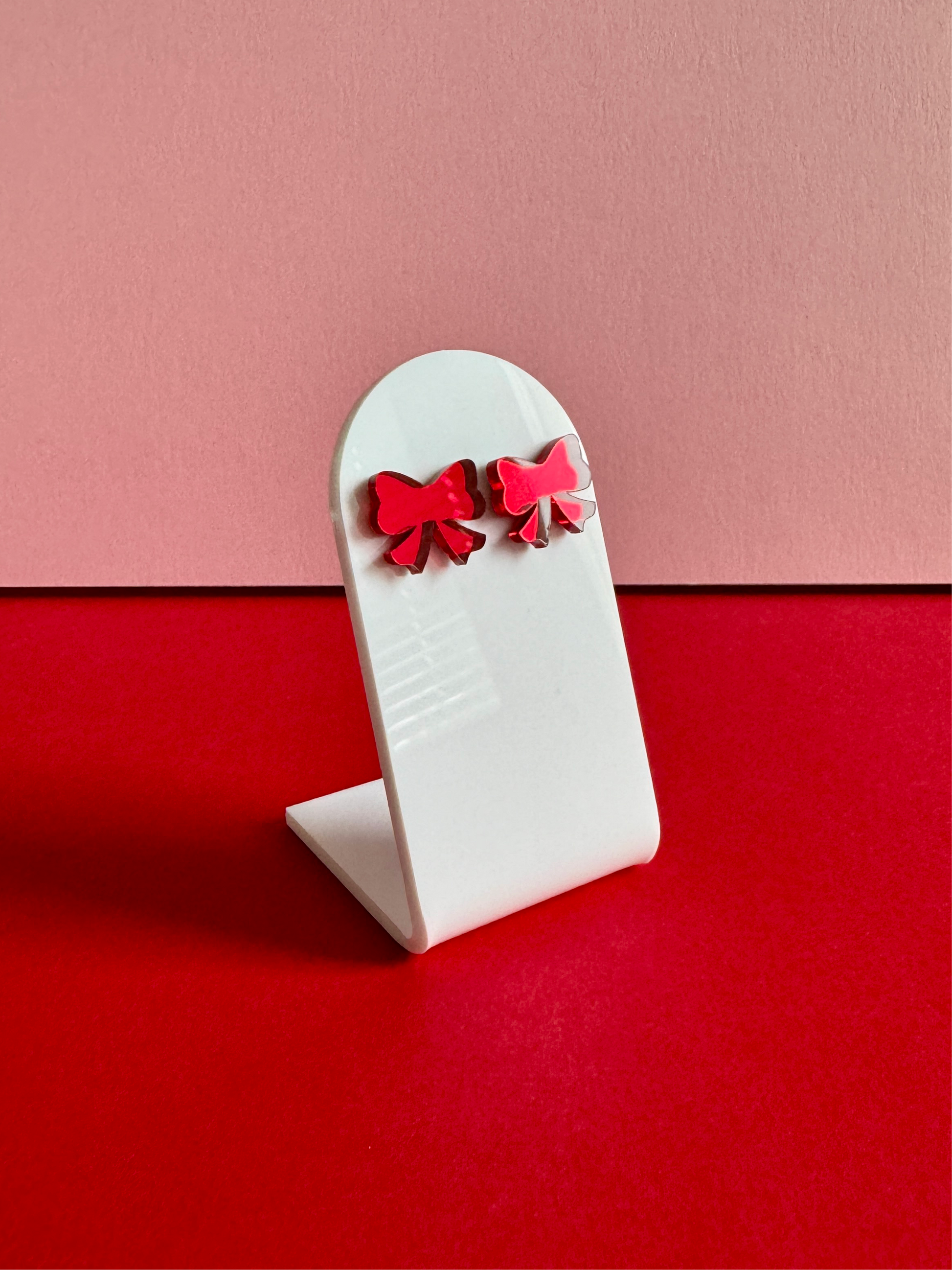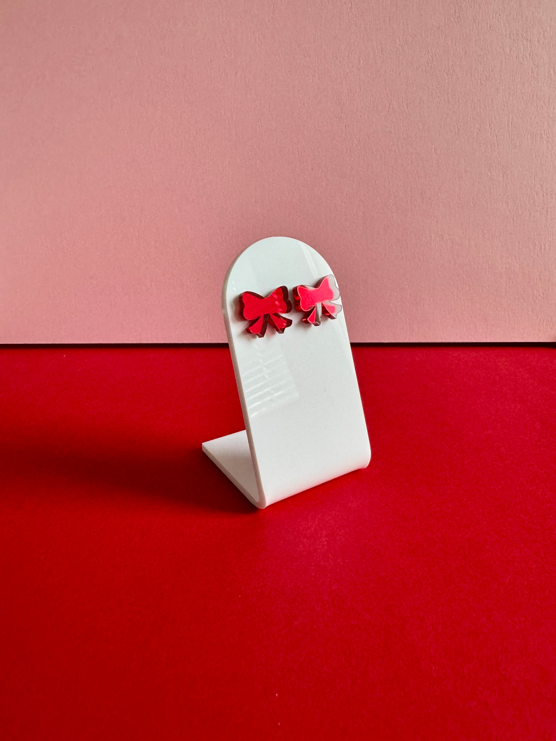 Rusetin muotoiset nappikorvakorut. Todella kaunista tummanpunaista peiliakryylia, joka sopii rusetteihin täydellisesti. Sopii hyvin jouluun ja ympärivuotiseen käyttöön.